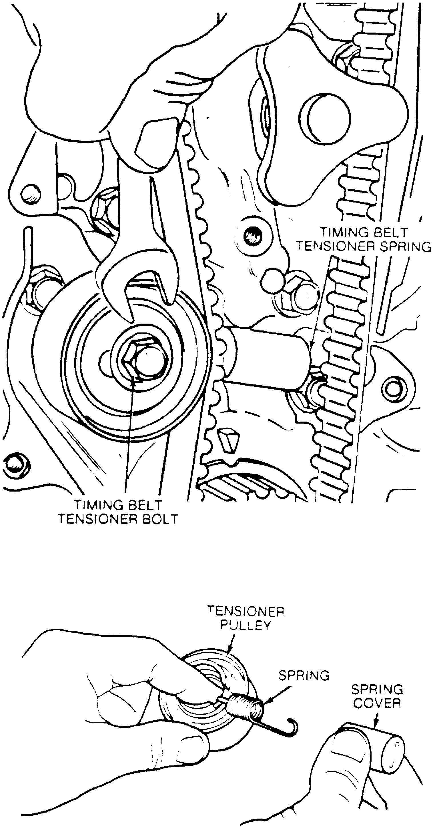 2. Remove timing belt tensioner pulley attaching bolt, then the tensioner pulley, spring and spring cover.