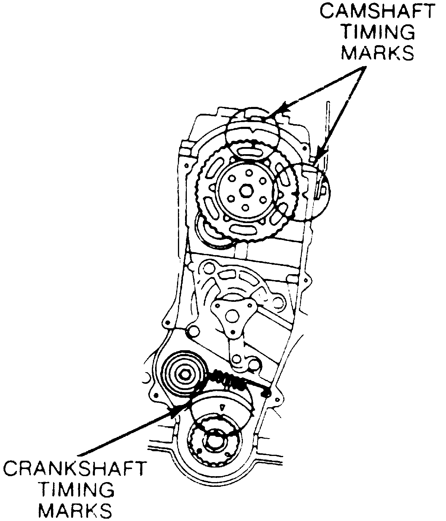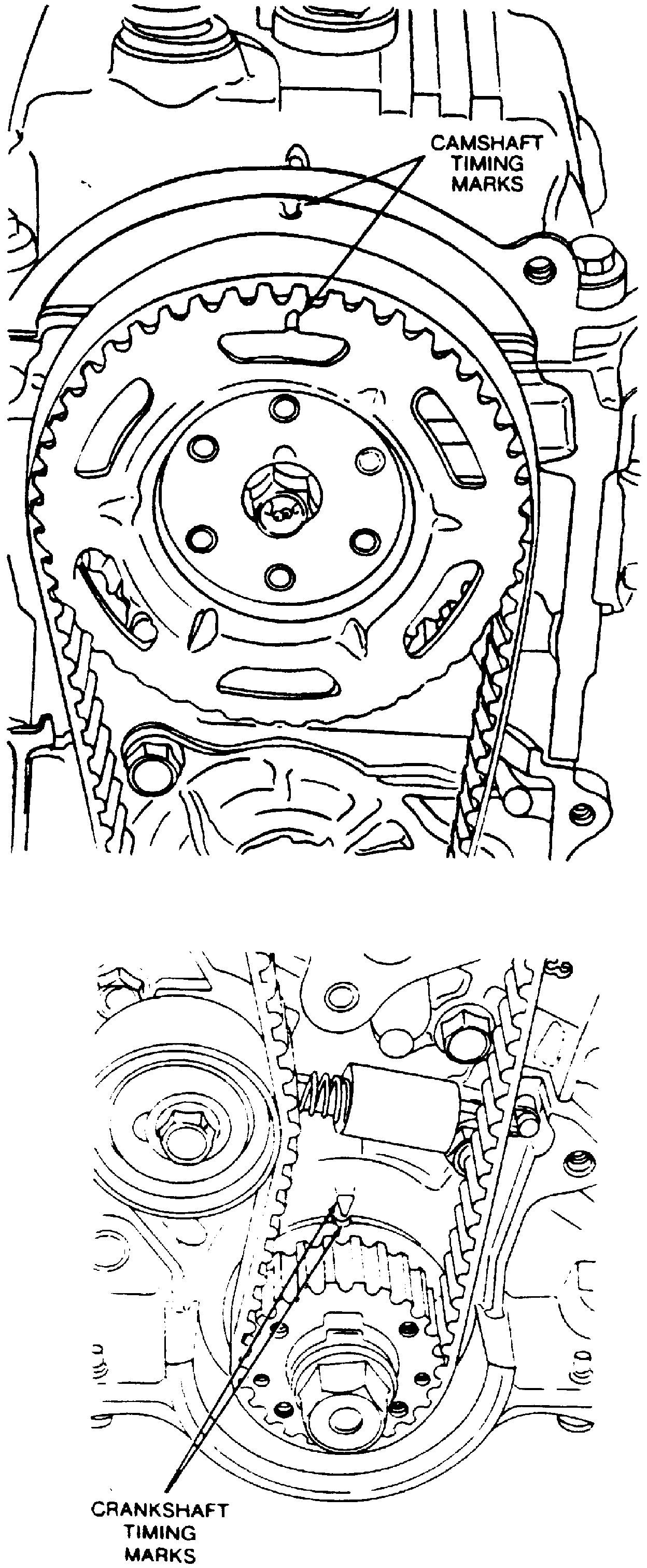 6. Align camshaft and crankshaft sprocket timing marks with marks on cylinder head and oil pump housing.