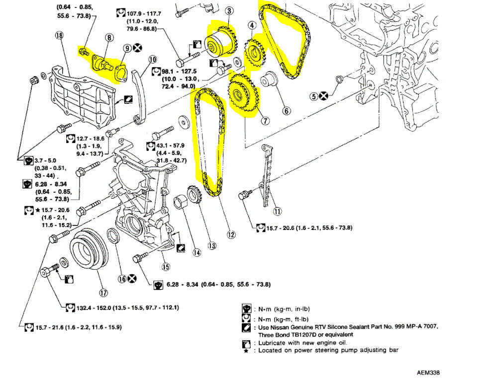 As far as the timing chain is concerned, there are two, an upper and a lower. I attached an exploded view of the chains. I highlighted the sprockets and chain tensioner for your reference. You can remove the cover to see if there is excessive play in either of the chains. Or, if possible, record it and upload it for me to hear and see how it's running (if running).