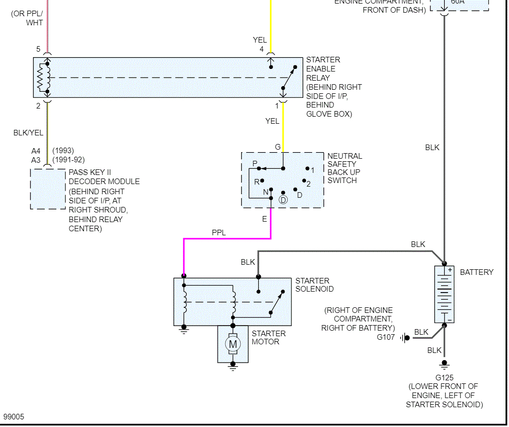 At the starter, there will be a heavy gauge wire that has 12v at all times. Also, there is a smaller gauge wire that is purple. It should only have 12v when the key is in the start position. Have a helper turn the key to the start position while you check for power.