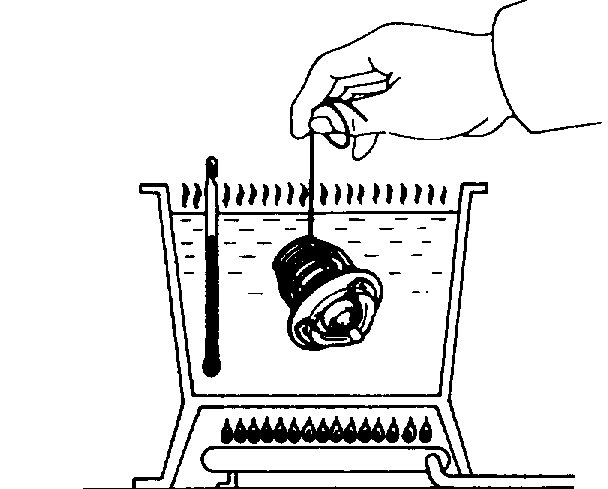 d. Check that the valve is fully closed when the thermostat is at low temperatures (below 40°C (104°F)). If not closed, replace the thermostat.