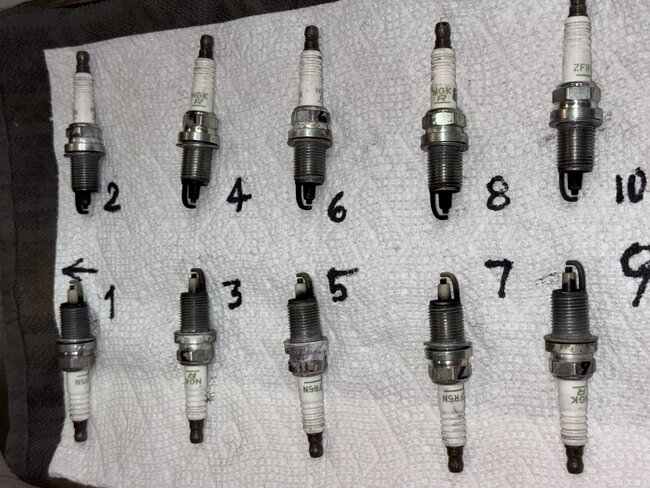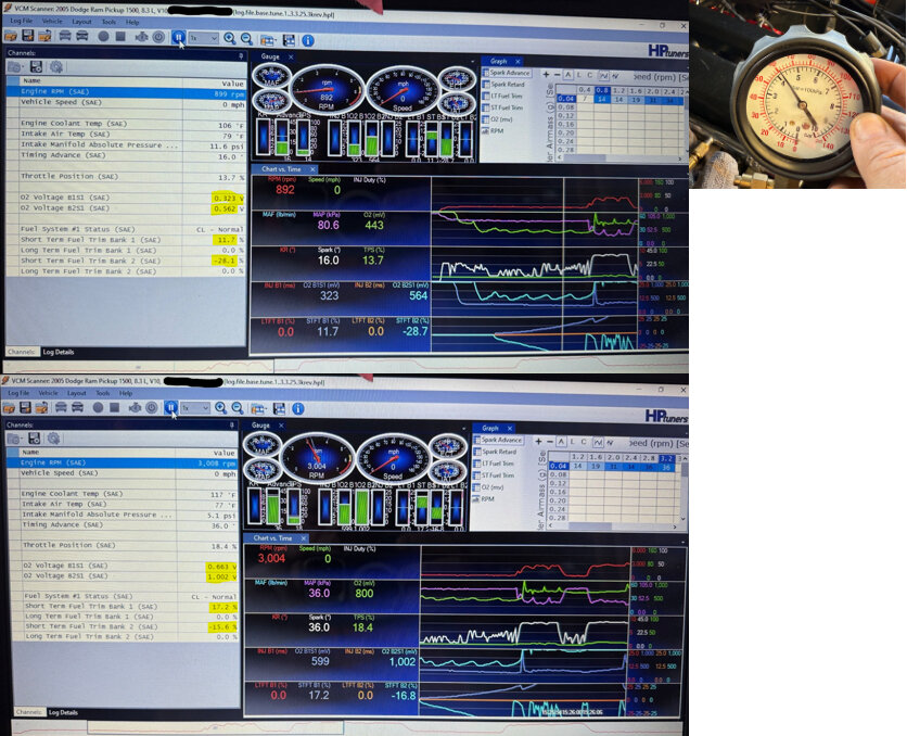 8.3L viper engine rebuilt with new ported heads Greg Good/JTS Venom (Valves are oversized to 2.02 intake and 1.60 exhaust) and new Cam (629 lift intake / 628 exhaust lobe at 114°). When a base tune (created by a professional tuner) remotely, in preparation to drive to dyno for full tune. A problem was noted with the short-term fuel trims. “ It is adding a lot of fuel to Bank-1 and subtracting a lot from Bank-2”. New Bosch O2 upstream sensors already installed on Bank-1 and Bank-2 (same issue the previous O2 sensors ). Even though Up O2s have unique connectors... To verify not swapped, one was disconnected and validated to be noted not responding on the correct bank in HP tuners software. A previous issue with two vacuum leaks were addressed to where now intake manifold pressure is 5.1-11.6 psi (3K rpms to idle). The engine was rebuilt with new spark plugs/wires, new OEM coil packs and all 10 injectors were cleaned. Fuel pressure verified 60 psi on Schrader valve on bank 2 rail (fuel comes in on bank 1 rail) both idle and under load (3K rpms). No leak on intake noted: sprayed stater fluid along runners of intake manifold plenum and no change in idle noticed. What would be the next troubleshooting step? I have HP Tuner and Bi-directional scanner available to test.