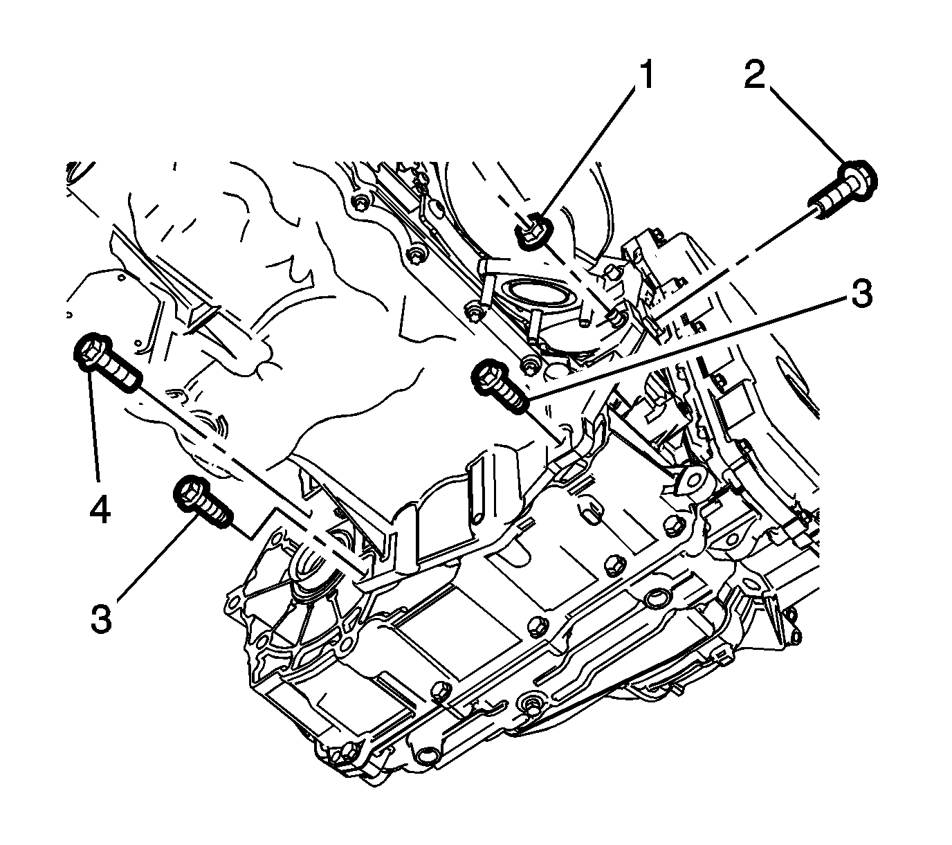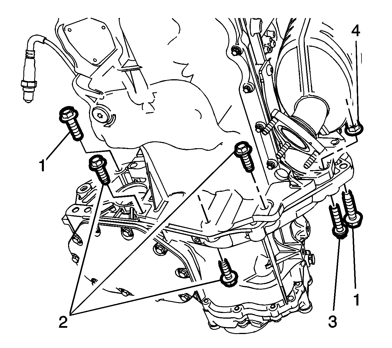 18. If equipped with an automatic transmission, install the lower transmission bolts (2, 4) and tighten to 60 Nm (44 lb ft).