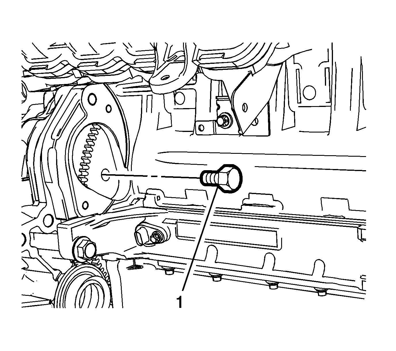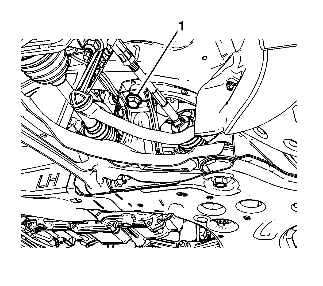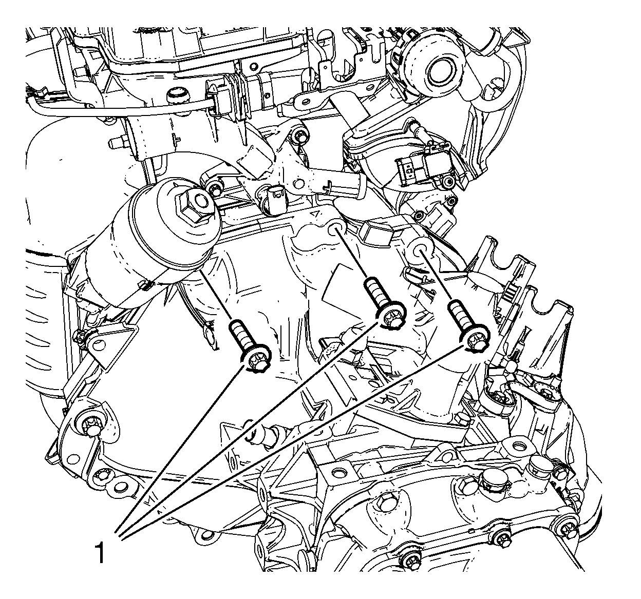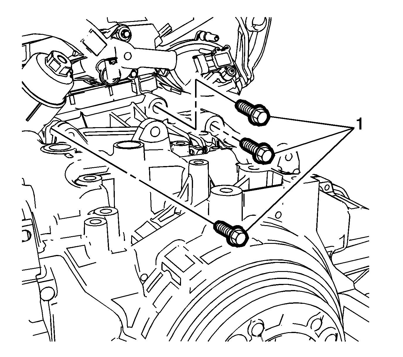 44. Remove and DISCARD the transmission mount bolts (1) - left side. Refer to Transmission Mount Replacement - Left Side See: Automatic Transmission/Transaxle > Removal and Replacement > Transmission Mount Replacement - Left Side.