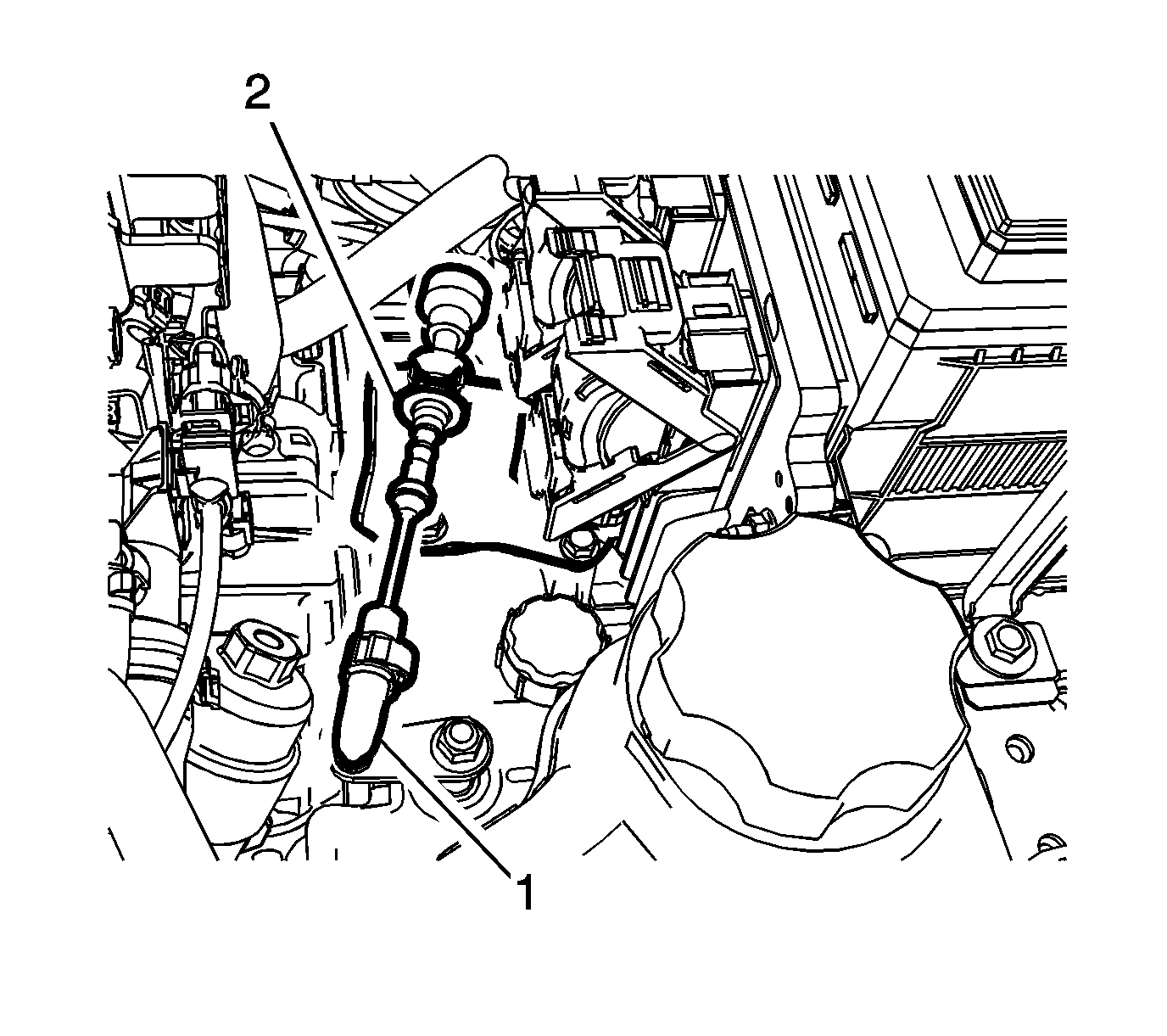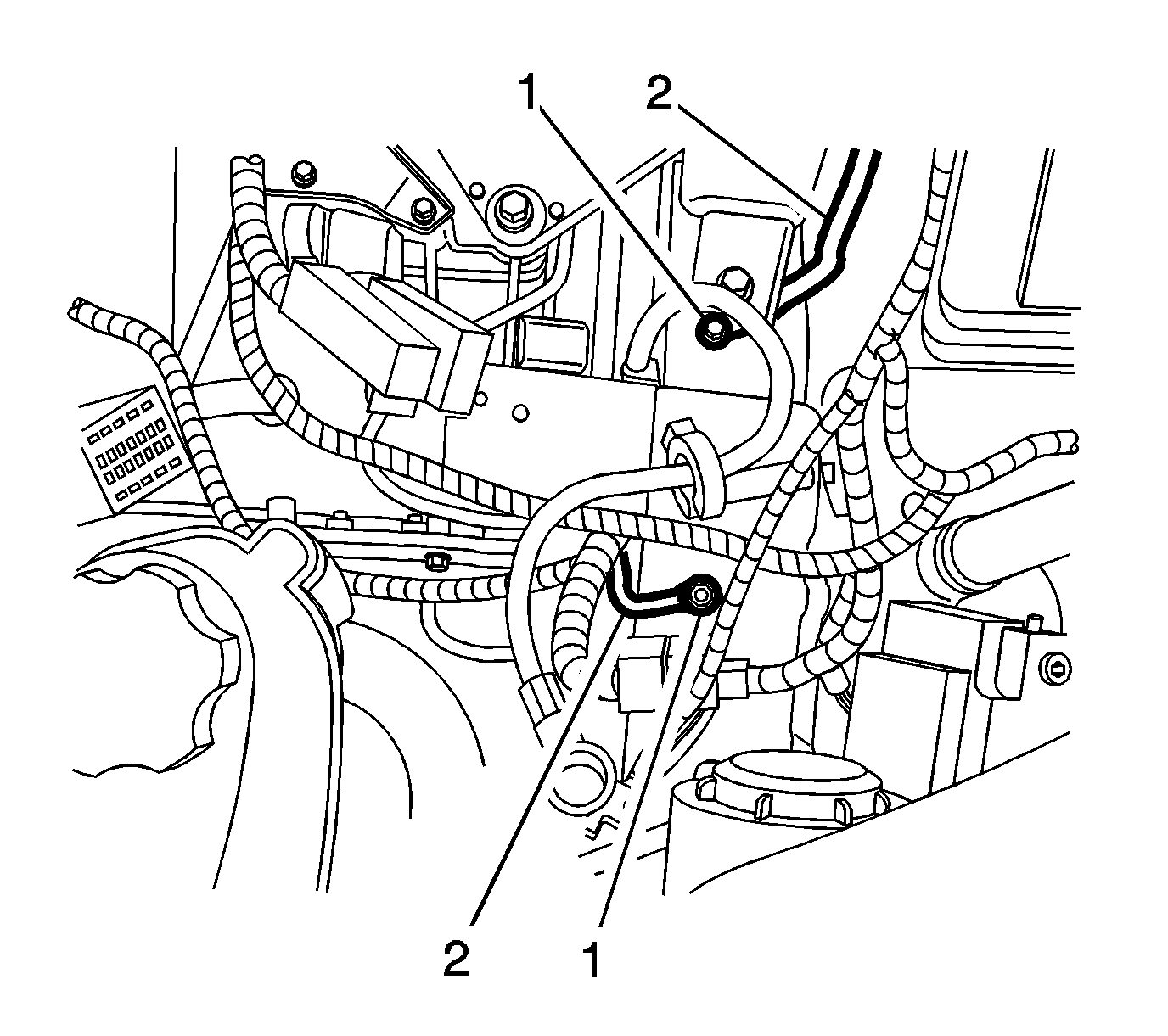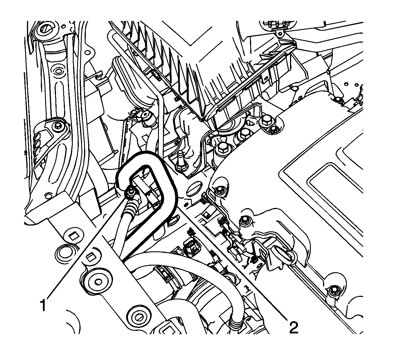 35. Connect the heater outlet hose (2) from the heater core. Refer to Heater Outlet Hose Replacement (2H0) See: Heater Hose > Removal and Replacement > Heater Outlet Hose Replacement (Front)Heater Outlet Hose Replacement (LUJ, LUV) See: Heater Hose > Removal and Replacement > Heater Outlet Hose Replacement (Front)Heater Outlet Hose Replacement (LUJ, LUV Rear) See: Heater Hose > Removal and Replacement > Heater Outlet Hose Replacement (Rear).