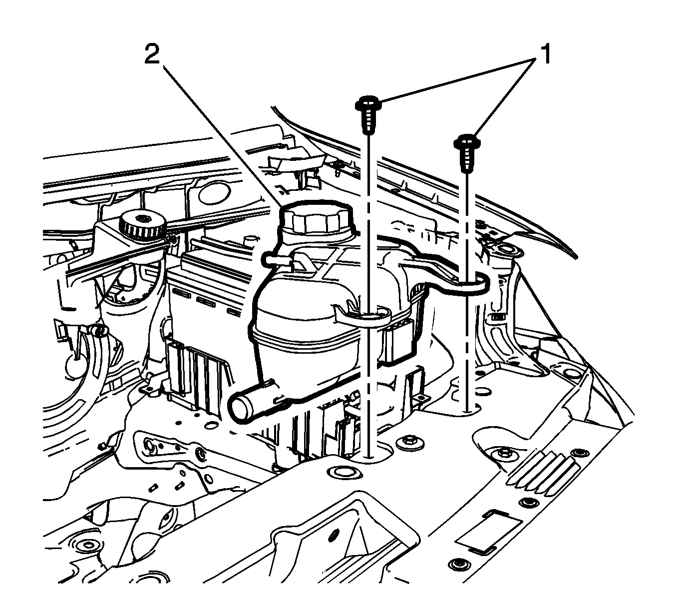 26. Install the radiator surge tank (2). Refer to Radiator Surge Tank Replacement (LUV, 2H0, LUJ) See: Coolant Reservoir > Removal and Replacement > Radiator Surge Tank Replacement.