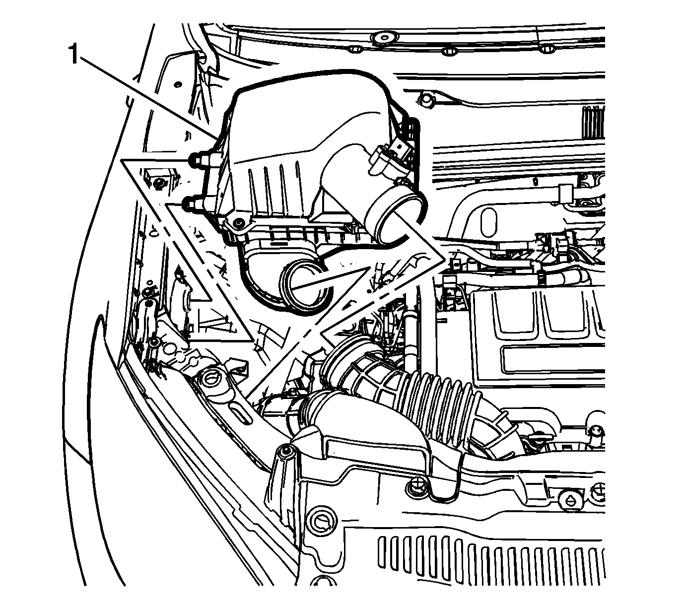 8. Remove the air cleaner assembly (1). Refer to Air Cleaner Assembly Replacement See: Air Cleaner Housing > Removal and Replacement > Air Cleaner Assembly Replacement.