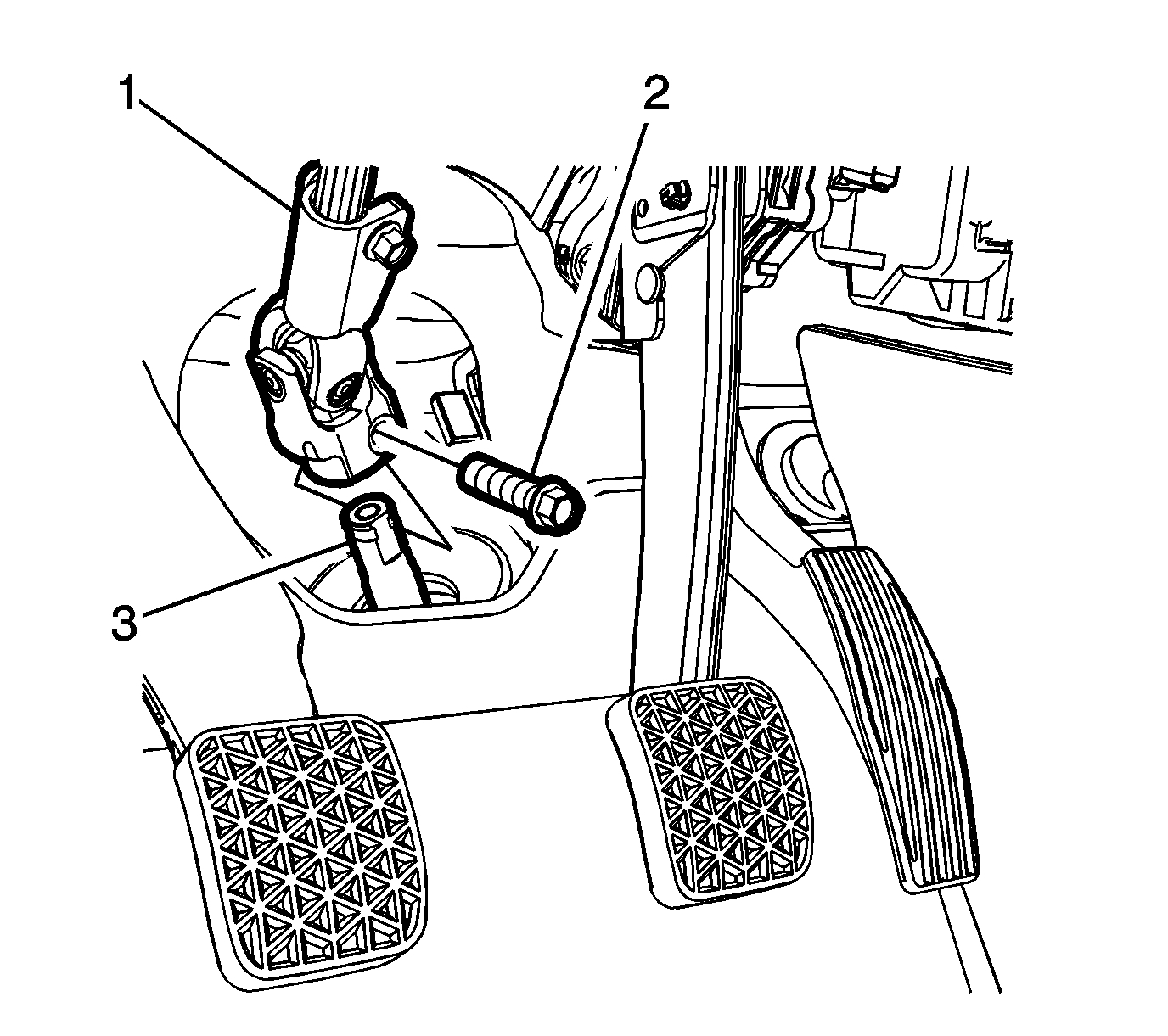 7. Remove the lower intermediate steering shaft bolt (2) and slide the shaft away from steering column. Refer to Intermediate Steering Shaft Replacement (NJ1) See: Steering Shaft > Removal and Replacement > Intermediate Steering Shaft Replacement (Non-Variable Ratio, Electric)Intermediate Steering Shaft Replacement (N40) See: Steering Shaft > Removal and Replacement > Intermediate Steering Shaft Replacement (Non-Variable Ratio).
