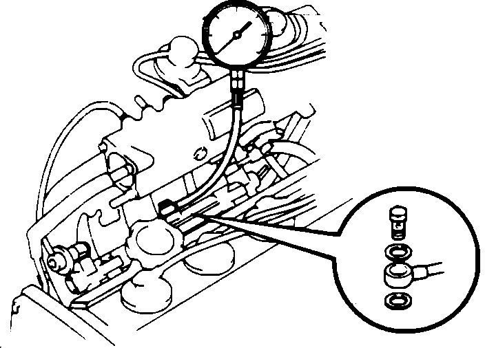 4. Connect a suitable fuel pressure gauge to the fuel rail using the union bolt and gaskets to provide a tight seal.