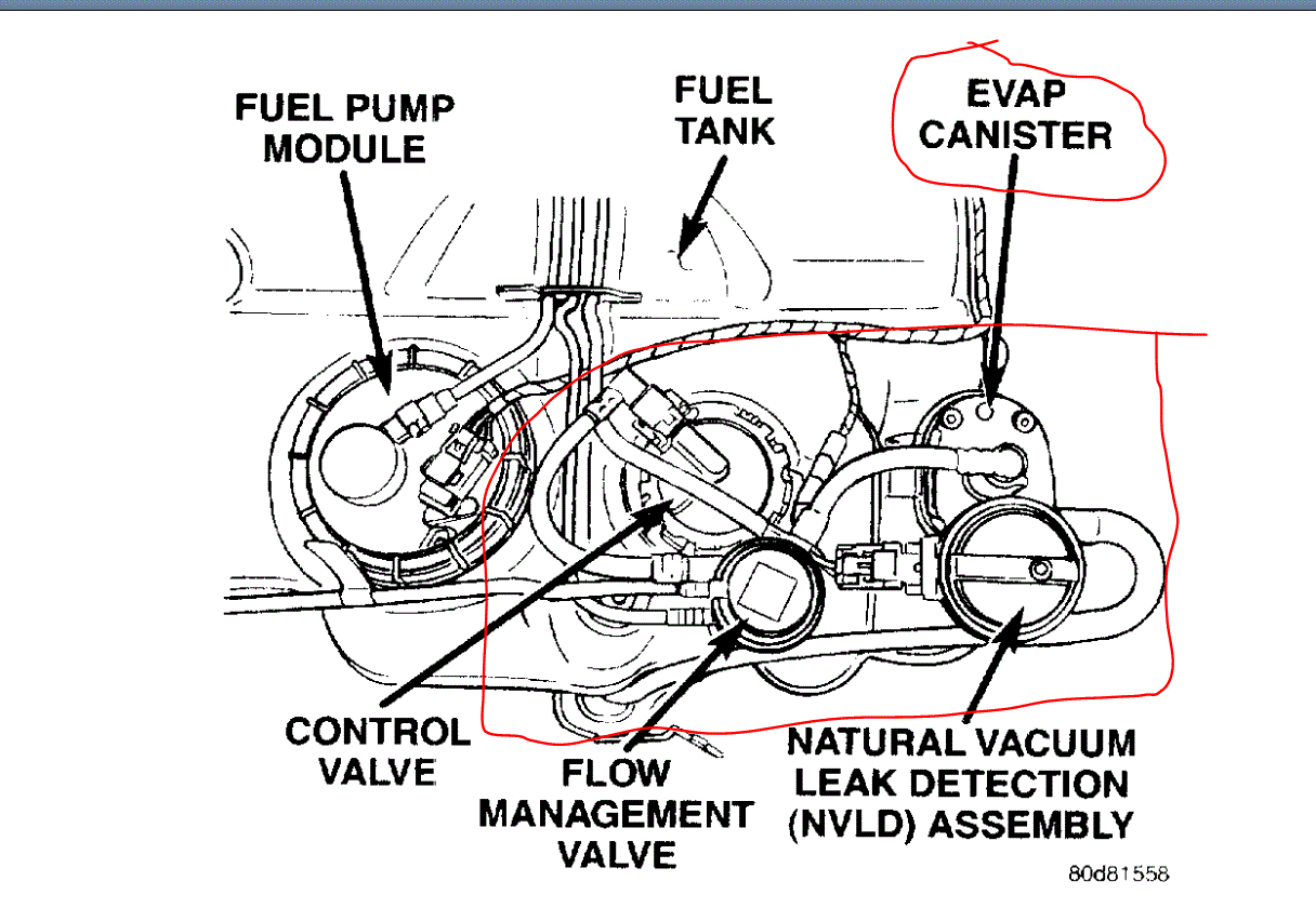 Next, is the actual evap canister. It is located near the fuel tank. If you look at pic 2, it shows the location and then I circled several vacuum hoses. Any of these hoses could be disconnected, damaged, pinched, or missing and causing this issue. So that is what needs checked.