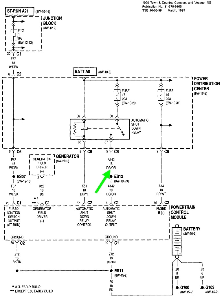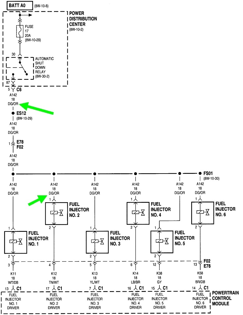 Next, if you aren't getting anywhere with diagnostic fault codes, you can watch the automatic shutdown, (ASD), relay with a test light. Best is to use an inexpensive one with a simple light bulb inside. A digital voltmeter can be used too, but they respond too slowly and may cause you to miss an important clue. Look for a wire that is the same color at every injector and every ignition coil. I included these diagrams only to show that this is the dark green wire with an orange tracer, (stripe). This wire at any injector or ignition coil can be used.