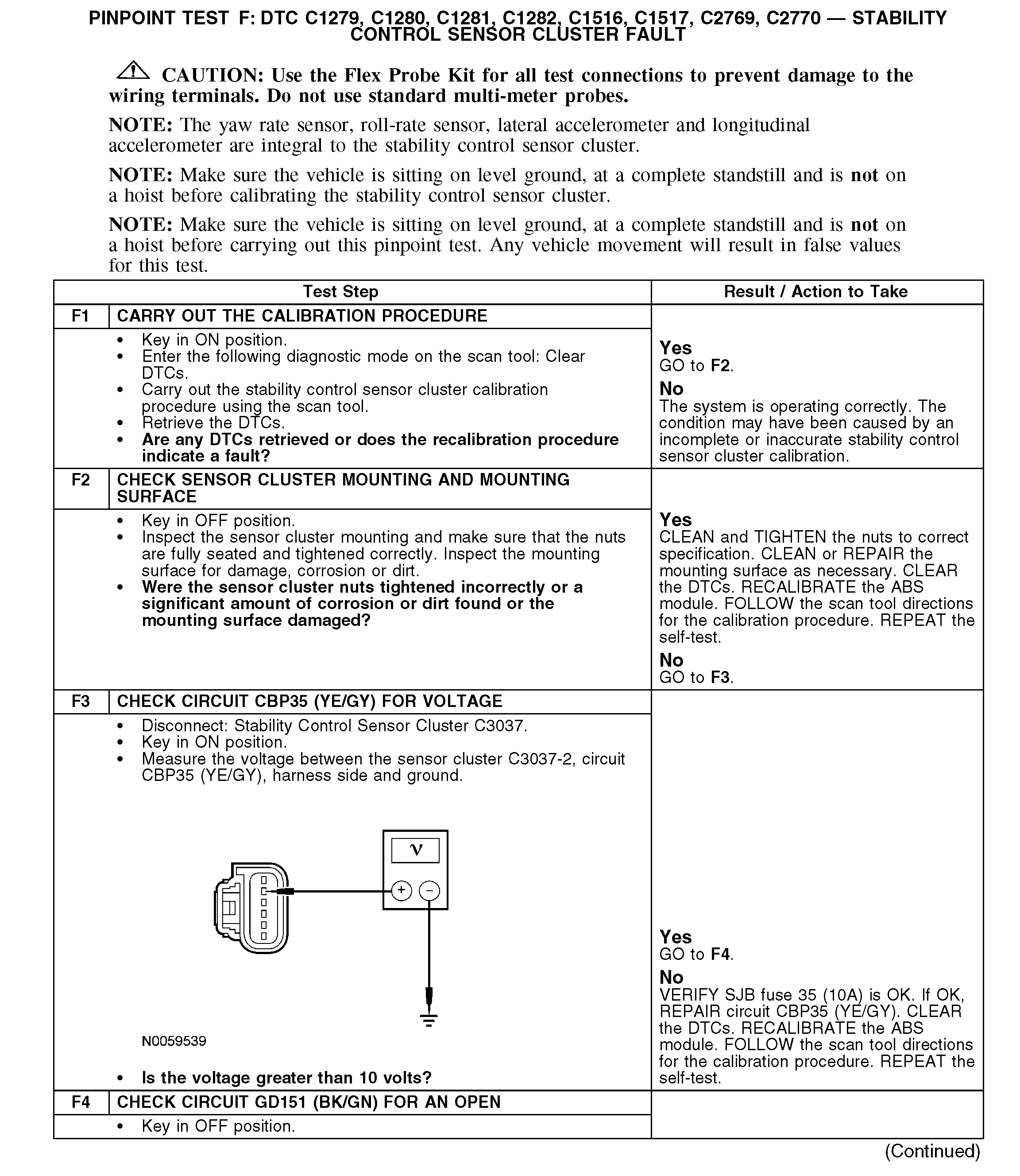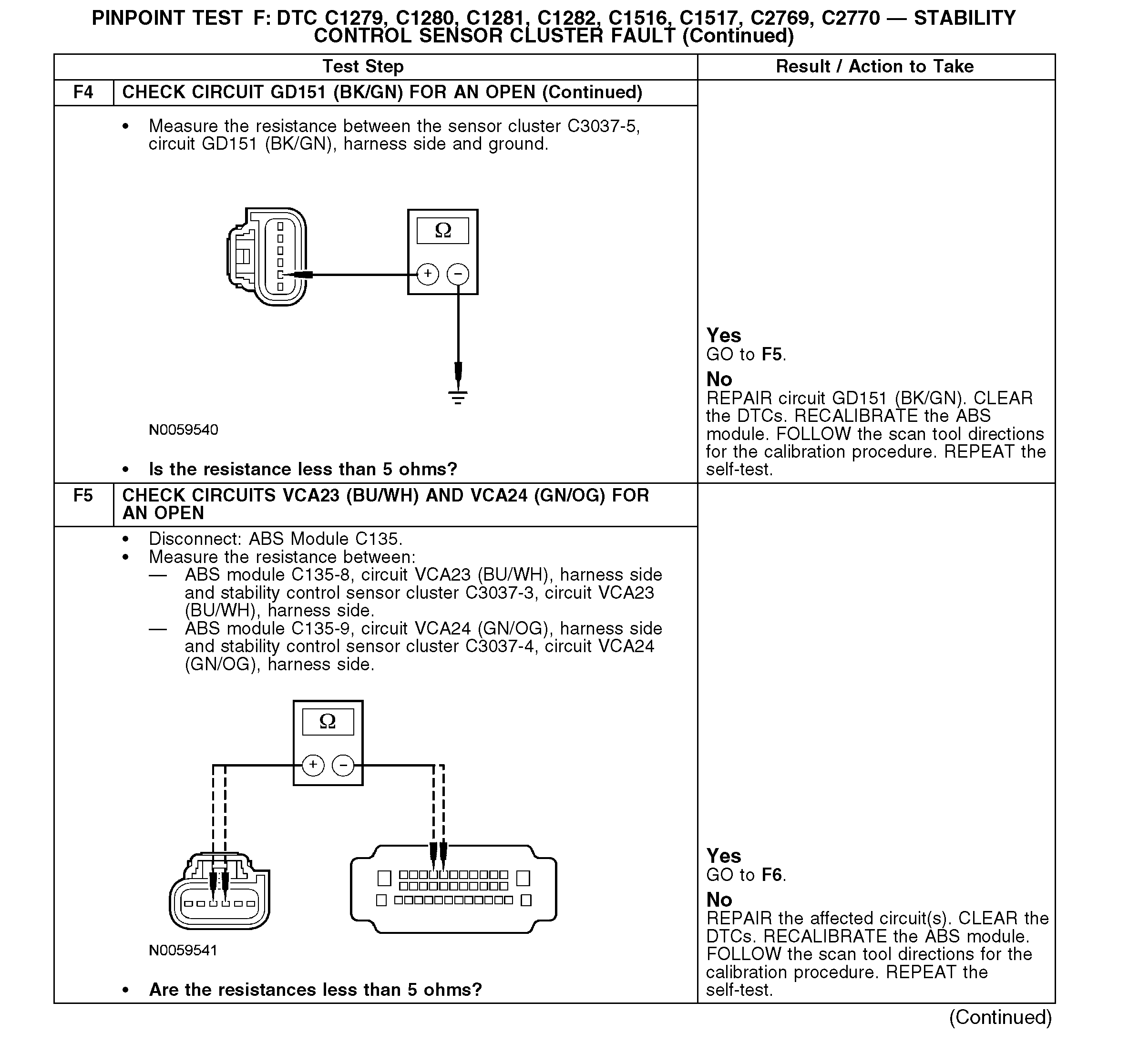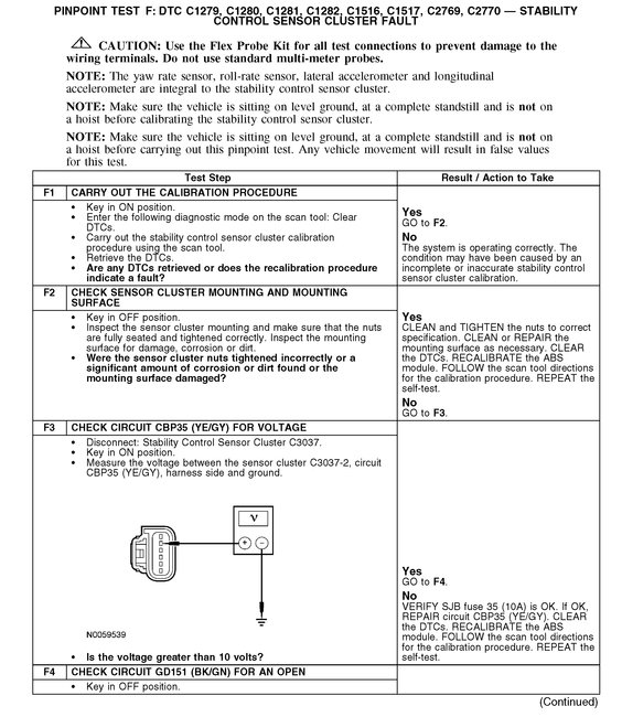 Vehicle Brakes and Traction Control Antilock Brakes / Traction Control Systems Testing and Inspection Pinpoint Tests Test F: DTC C1279, C1280, C1281, C1282, C1516, C1517, C2769, C2770 - Stability Control Sensor Cluster Fault