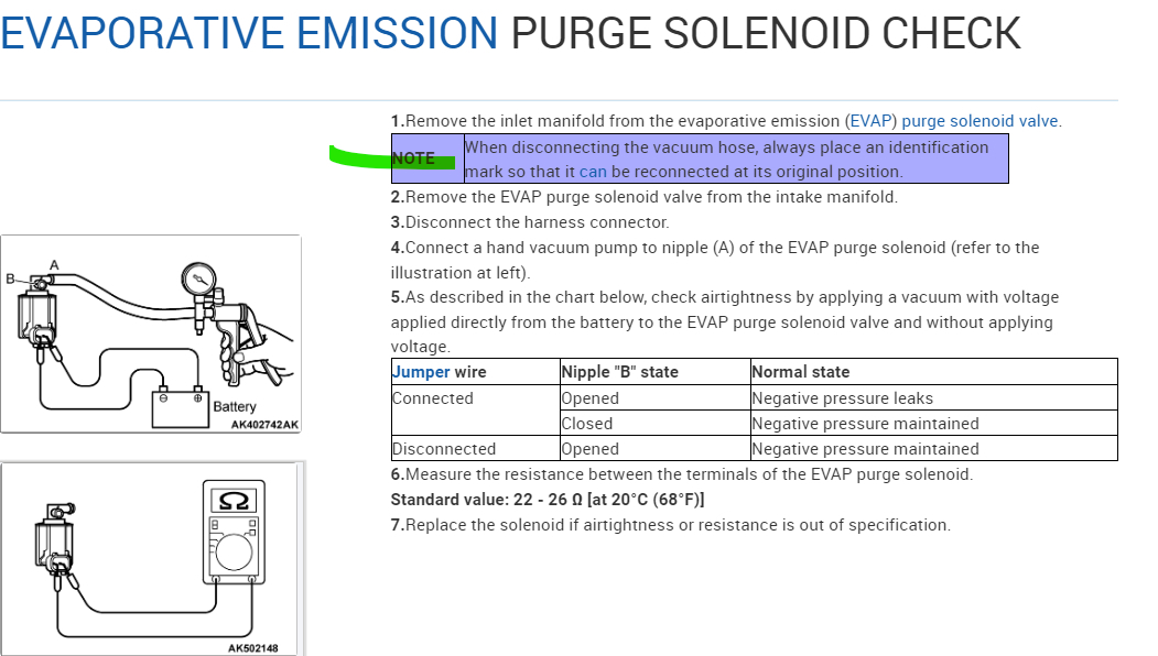 Here is the location and testing procedure to check the Purge valve, this one is a bit different than a conventional Purge valve, it needs to be tested with a hand vacuum pump, while being energized. And yes, it's in a very difficult spot, the testing is off the vehicle testing. And if you do take it off or replace it make sure you mark where each hose to the valve goes, or you will get them mixed up easily. I have seen purge valves put on backwards causing Purge valve circuit codes that took a week to figure out what had happened. Apparently, the customer had it reversed and manifold vacuum was pulling it open on its own. But these small leak codes can be very difficult to find. And when I mean a small leak, the test run by the system is at 0.29psi held in the gas tank. Now atmospheric pressure is about 14psi, so this 0.29psi is actually a vacuum held in the tank. The Fuel Tank Pressure sensor monitors this pressure and watches for it to rise, that's how it determines if there is a leak. In the automotive world this is one of the most difficult Evap leaks to find. Because it doesn't have to be from one location, it can be a couple very tiny leaks causing it as well.