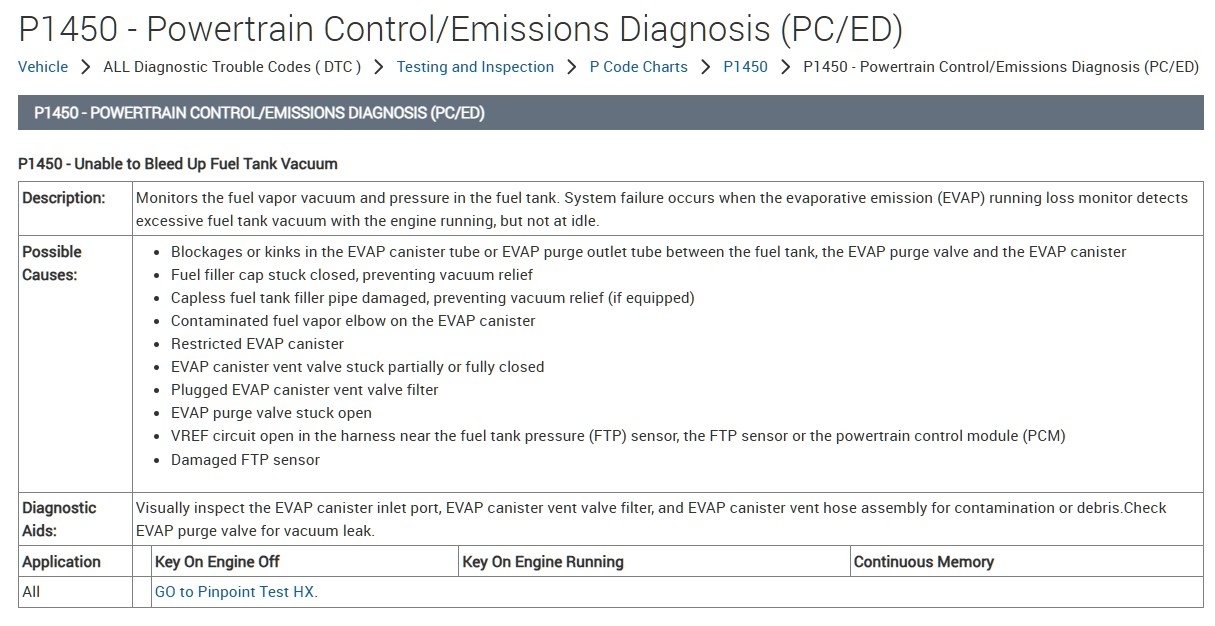 Ok so some codes are still setting. And this P0443 is a circuit code for the Purge valve, with the P1450 being a trouble code for "Unable to Bleed Up Fuel Tank Vacuum".