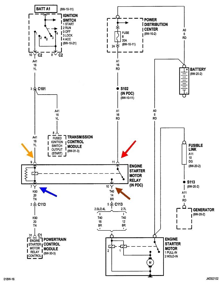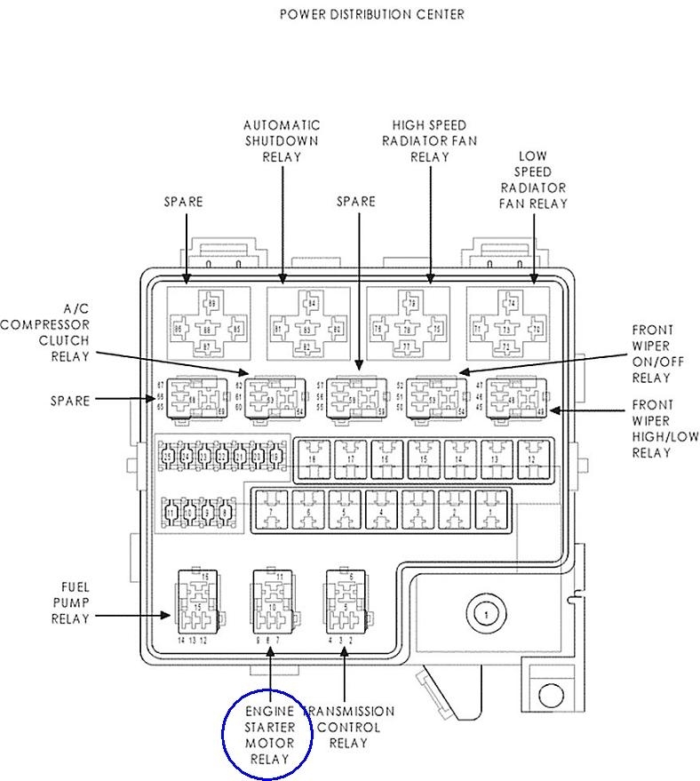 This starter diagram is for the Sebring Sedan 2.7L. If you have a different model or engine size, the under-hood fuse box may look different, but the test procedure is the same. In fact, it's the same for almost all vehicles that use a starter relay. Remove the starter relay. The entire system can be broken down into four circuits, each with a corresponding test point in the socket.