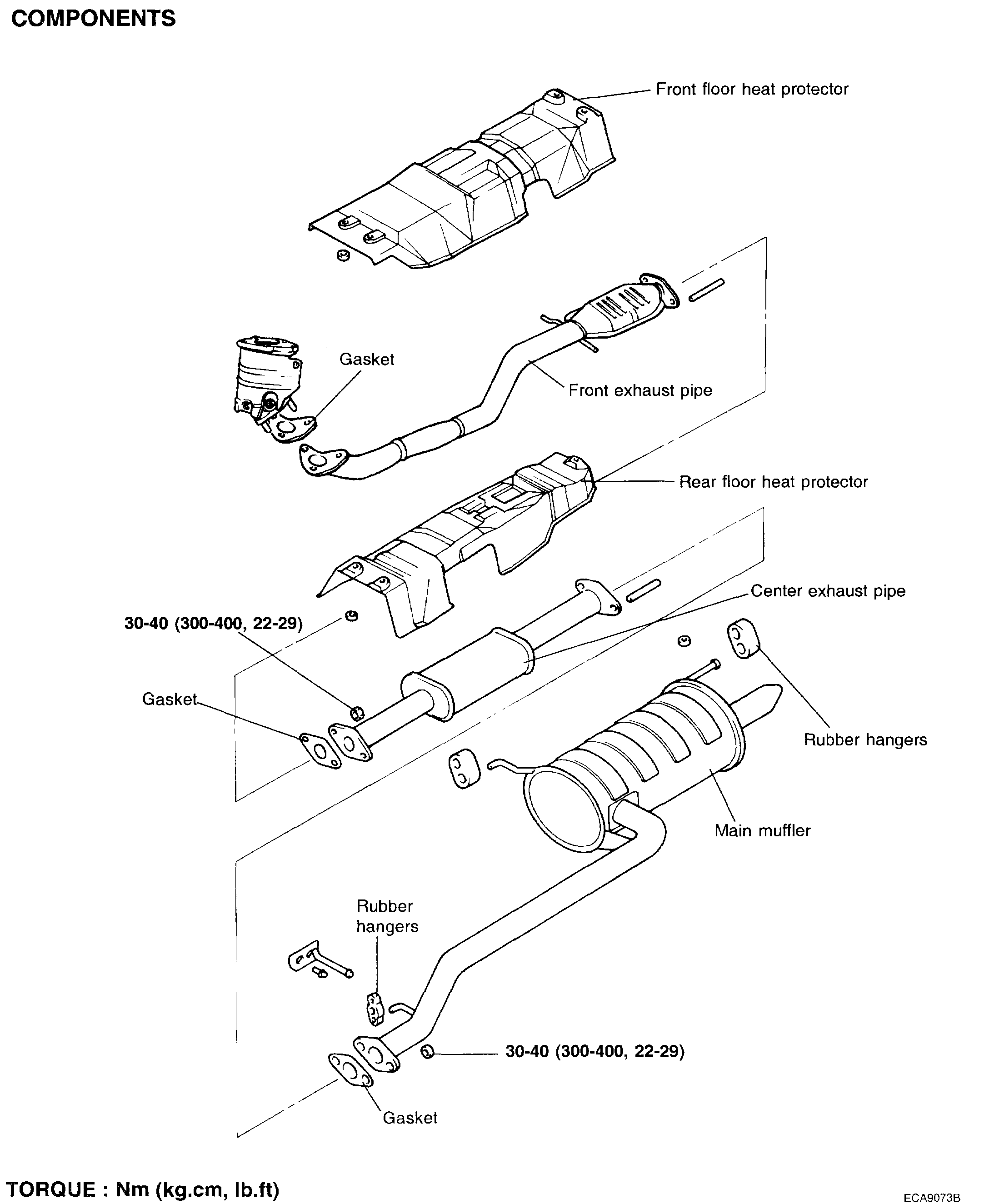 1. Temporarily install the front exhaust pipe (Rear catalytic converter assembly), the center exhaust pipe, and the main muffler, in order.