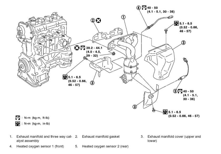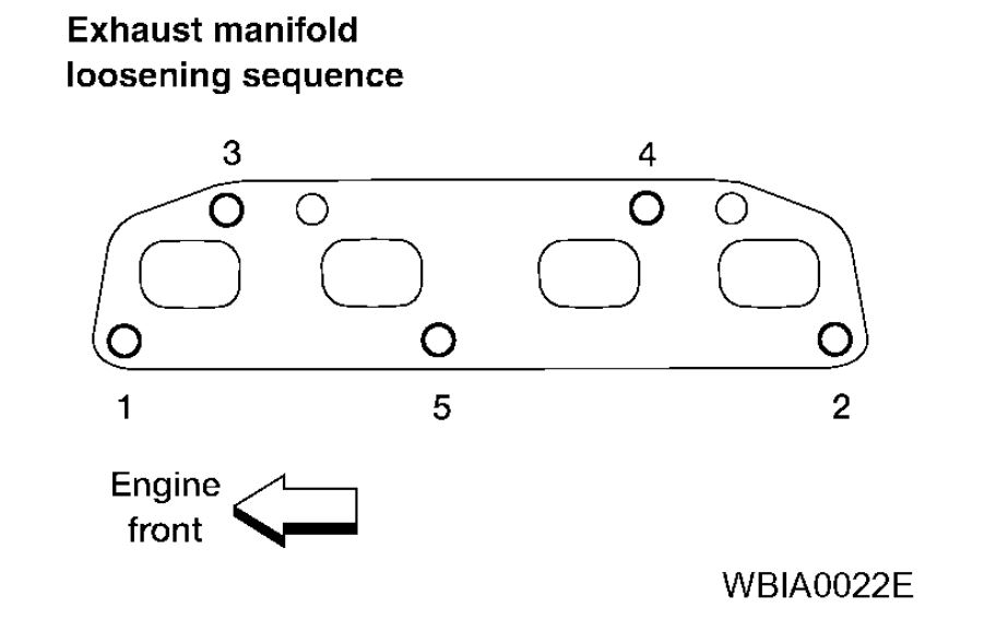 7. Loosen the nuts in the sequence shown, on the exhaust manifold and three way catalyst.