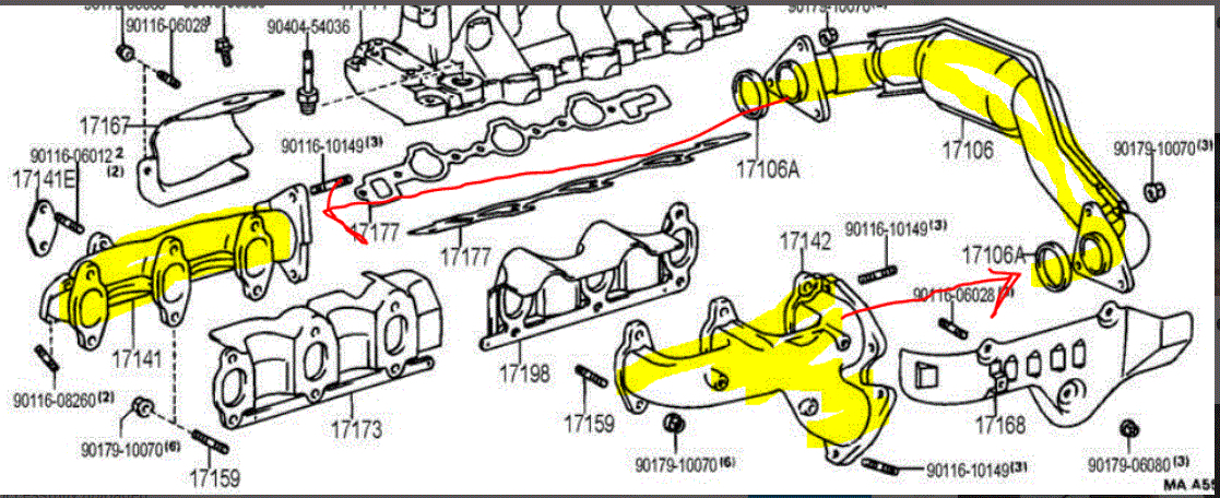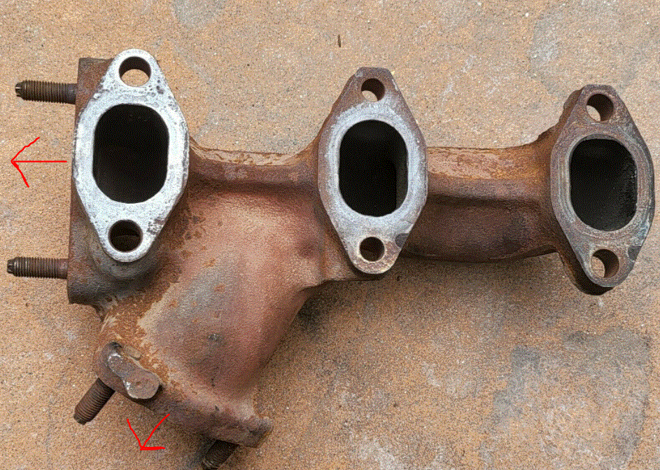 Pics 1 and 2 are the manifolds. Pic 1 is the driver's side and pic 2 is the passenger side. The third pic is an exploded view, and I highlighted the cross-over pipe. Note that the driver's side has two outlets. One is for the cross over and the other attaches to a downpipe for the exhaust.