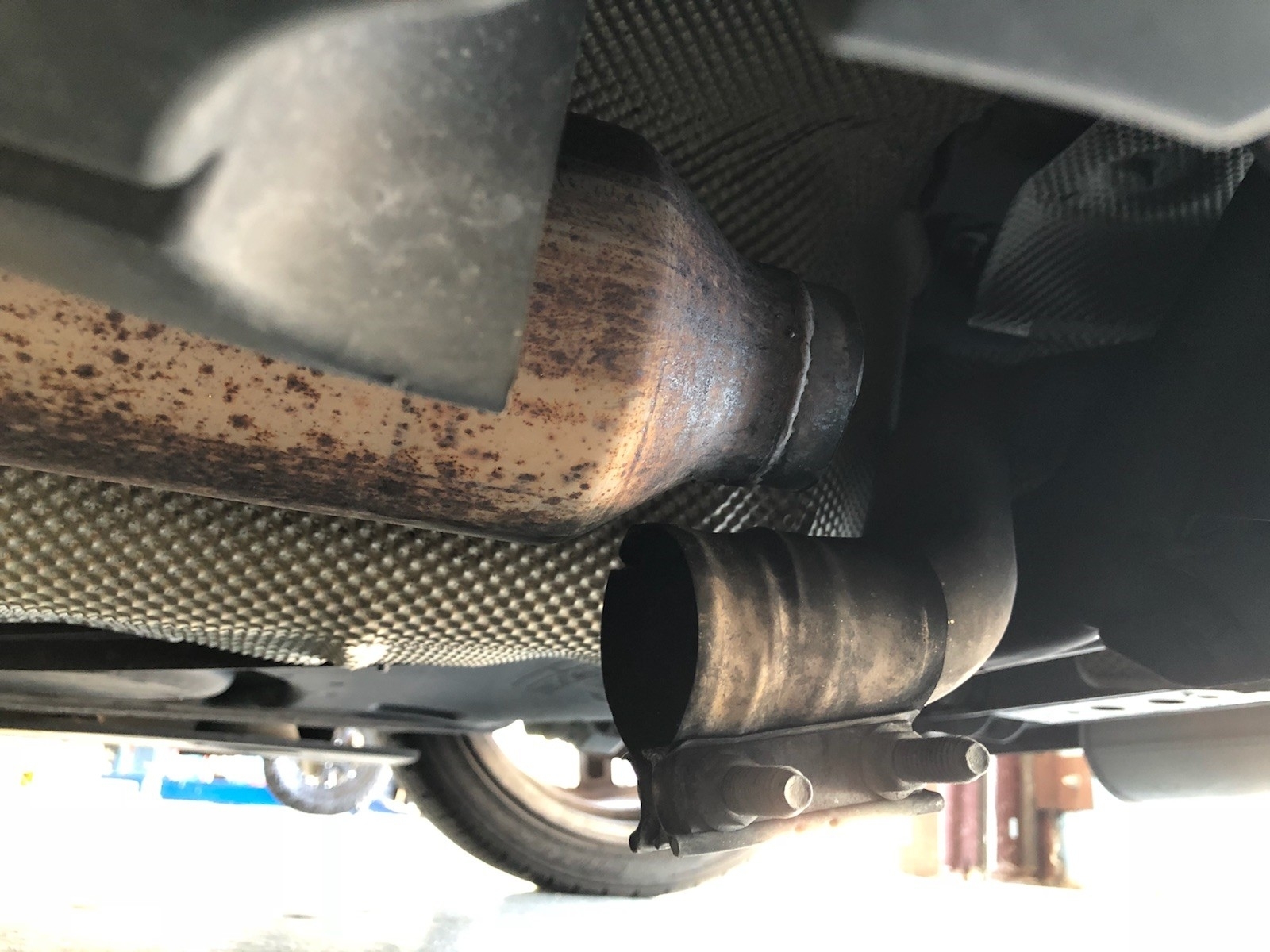 That is a common issue, the pipes weld broke off from the secondary converter outlet. Just not usually an issue on a four year old car unless someone ground the weld off. The clamp that is on there was a band aid that has come off. The easy repair which would last would be to remove the clamp. Clean up both pieces, slip it back together and weld it back in place. It looks like the pipe is okay under the clamp. If the end of the pipe is bad then a short coupler could be added in and welded. Those cars came with a stainless exhaust but some folks want them loud so they cut off the factory pipes thinking loud equals power increase, when 99% of the time they actually lose power on a modern engine.