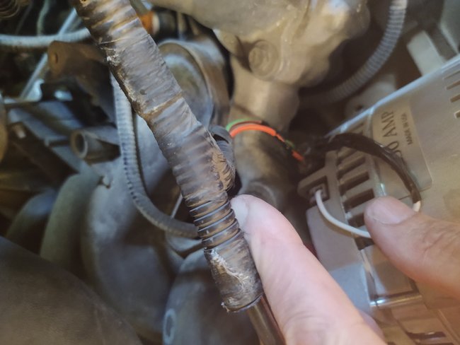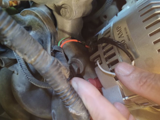 I'm waiting for my access to online service manuals to be fixed. Until then, I can share that the white wire you have your thumb on, (dandy photos, by the way), comes from within the generator and goes right back into it on that three-wire plug. That is mainly a Ford thing going back to the mid '60s. When the charging system is working, that wire taps off part of the output circuitry and will have exactly half of system voltage on it, or roughly 7 volts. That is the voltage that tells the voltage regulator the system is working and for it to turn off the warning light on the dash, when you have that. You can also use that as a test to see if the charging system is working.