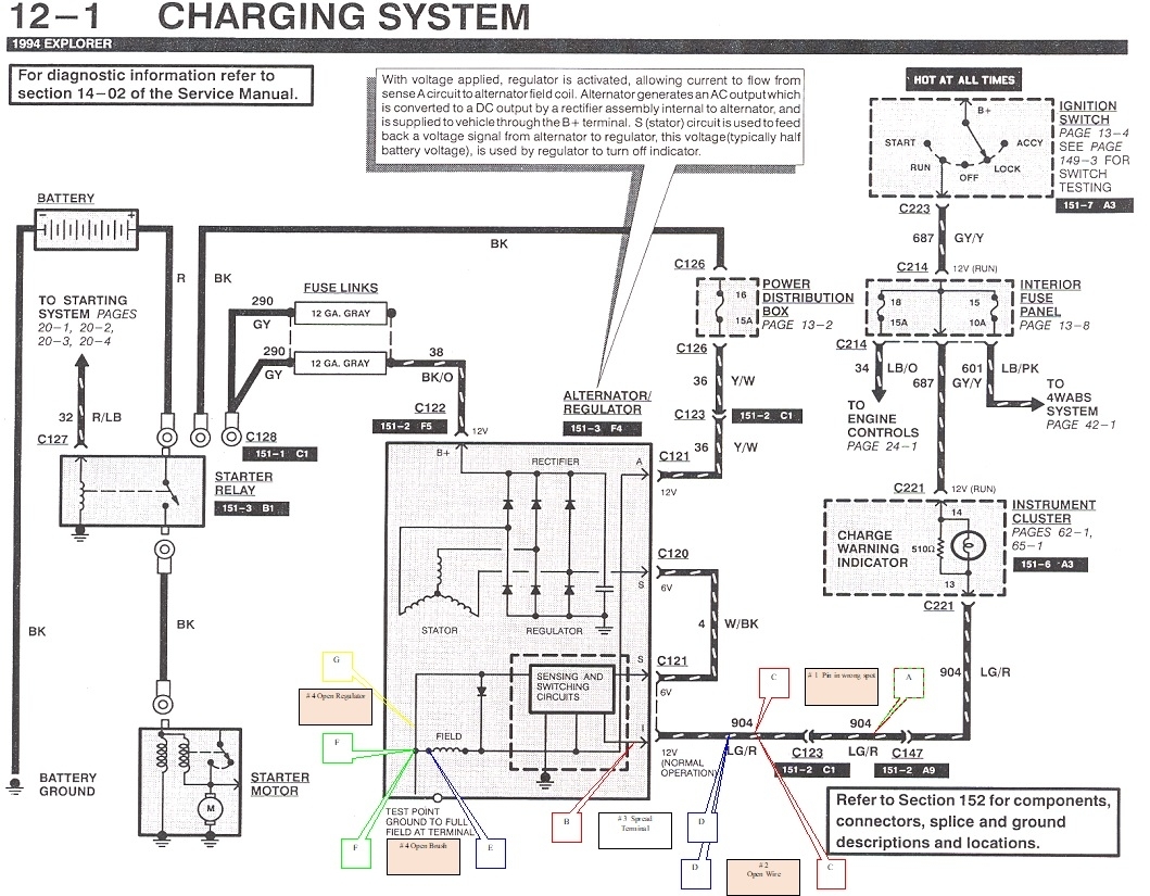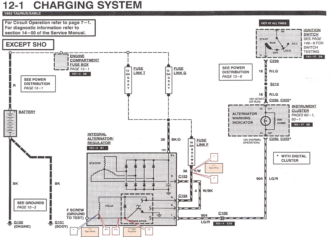 For all of this to work, the system is powered through the yellow / white wire shown at the top of the generator, right side, and it has a tiny "12V" notation under it. That one must have full system voltage at all times. You'll find battery voltage of 12.6 volts with the engine off, and typically 13.75 to 14.75 volts with the engine running. This circuit is the source of a real lot of failure-to-charge problems including after the generator has been replaced. I mentioned earlier that the fuse often blows for no particular reason. I added the second diagram because I noticed in this '94 Taurus, they did away with that fuse in favor of a fuse link wire. Those are a regular wire, but of a smaller diameter making them the weal link in the chain. The insulation is designed to not burn or melt. They take some time to burn open, so they act like a slow-blow fuse. In the 2002 diagram I have on file, they again show a fuse, so now I don't know yet which you have. You didn't find a fuse listed in the under-hood fuse box, and they don't show or list fuse link wires. Regardless, you gotta have 12 volts on that wire. Even if you aren't sure of wire colors or their order in the plug, just measure the voltages on all three with the ignition switch turned off. Two are going to have 0.0 volts and that yellow / white one must have 12.6 volts.