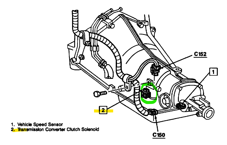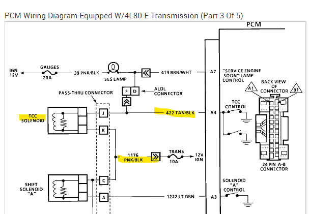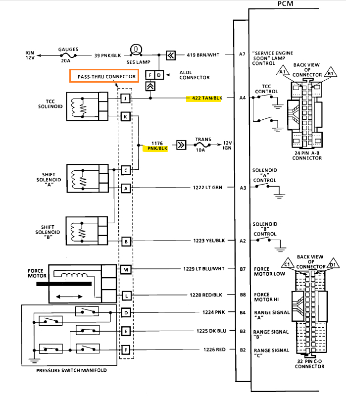 There are only a couple Pink/Black wires, and the closest connector I see is the TCC solenoid connector possibly. It has a pink/black wire and a tan/black wire. So, with the key on the pink/black wire it should read 12v. It may have been unplugged previously by someone else if the Torque Converter solenoid was not working or the Torque converter clutch was not locking up, possibly slipping. You could check around the transmission bell housing to see if there is any 2-pin connector there missing its wiring, it looks like it might reach down that way.
