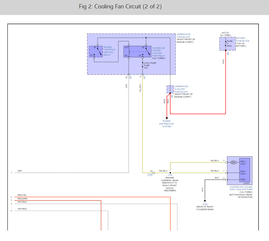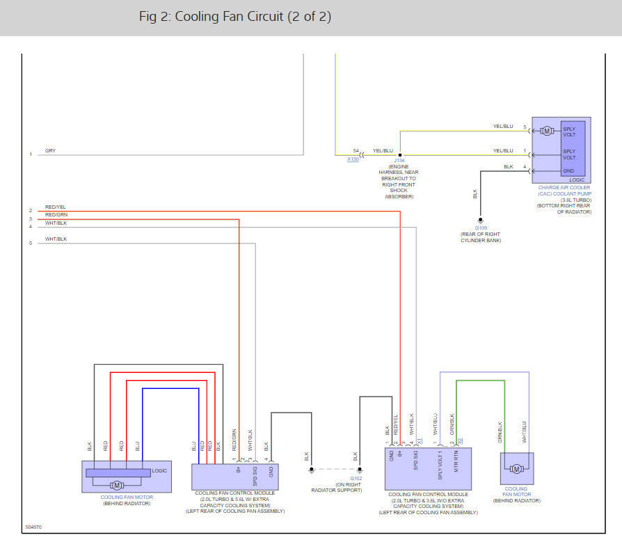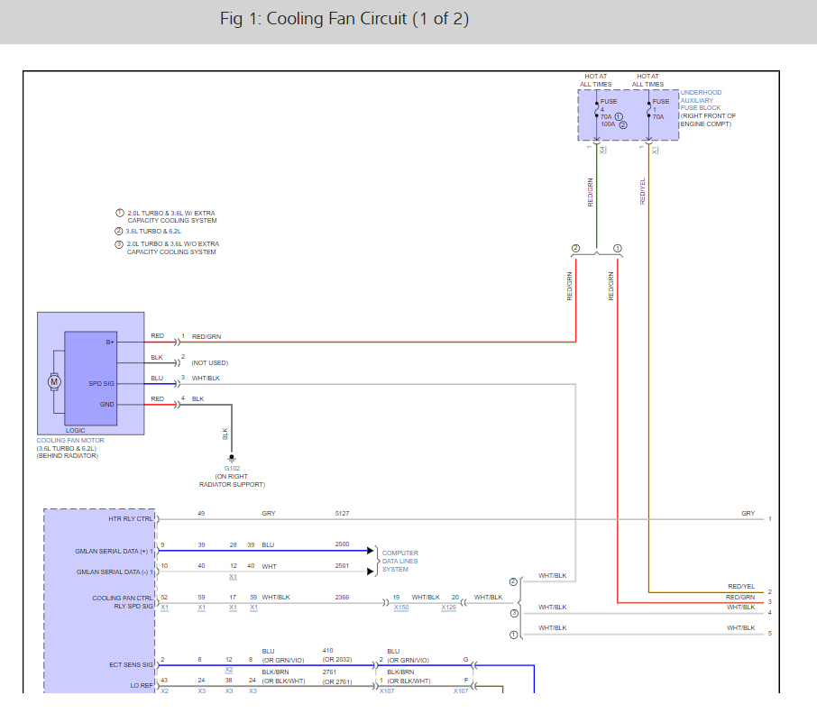 In the right front fuse panel, there are 2 fuses # 1 - 70 amp and #4 - 70 amp that we need to check. Here is a guide to help and I have found the cooling fan wiring diagrams. If the fuses check out there is a cooling fan control module that sounds like it is not working, here is the location as well: