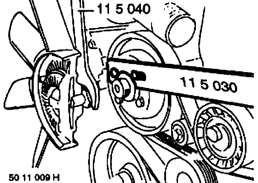 Using special tool 11 5 030, grip pulley and unfasten cap nut from water pump using special tool 11 5 040.