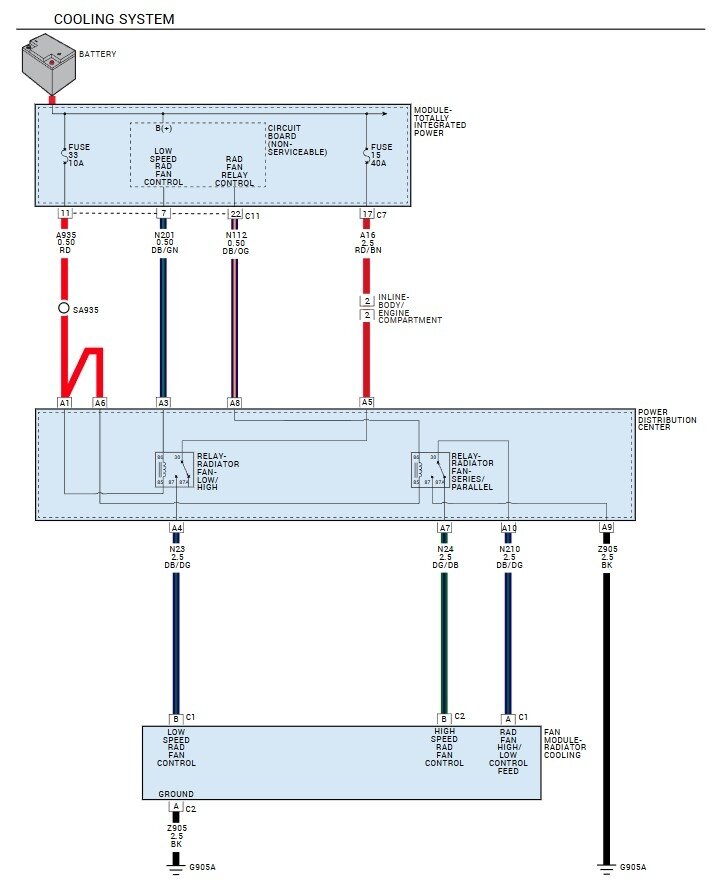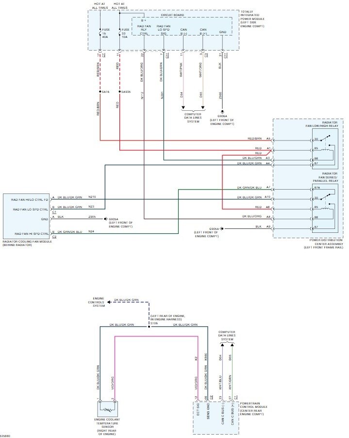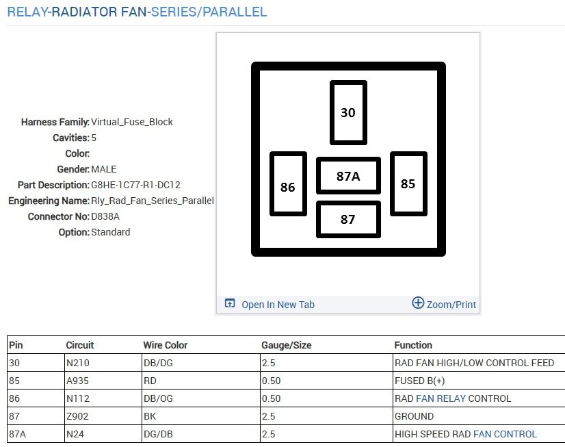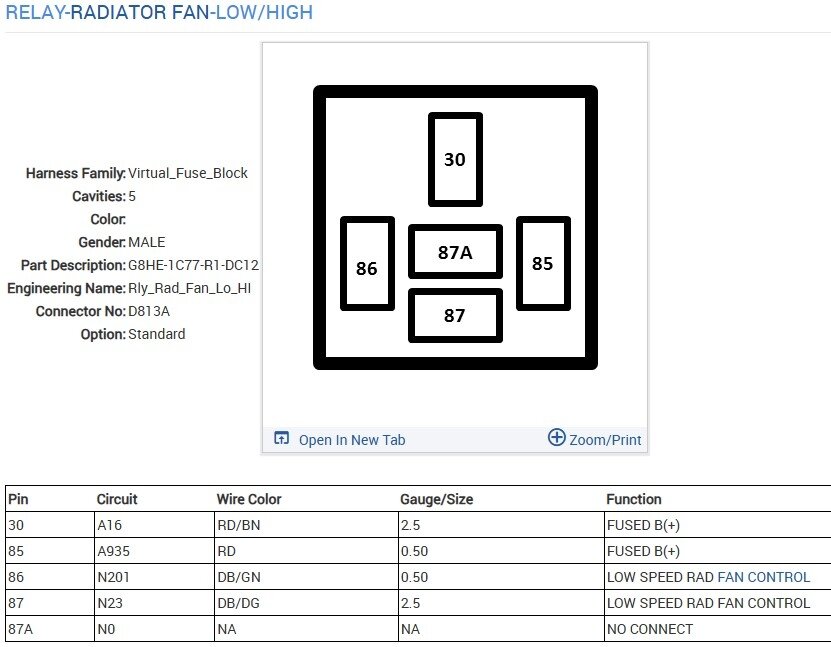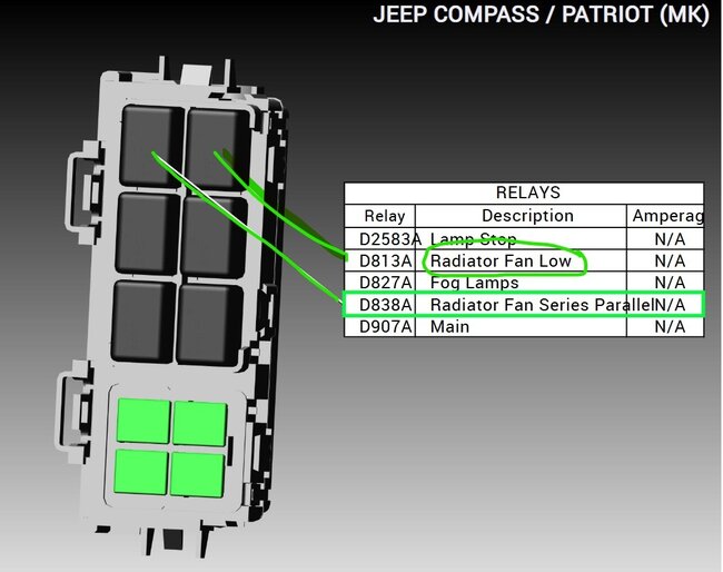 These are the diagrams and location for the relays, however this problem may not be a relay. Testing will show if it is though. The relays are in the fuse and relay block at the front of the engine compartment. There are two of them, one turns on both fans at low speed, the other changes the ground path so that both fans operate on high speed. To test them a simple test light will work. If you remove either one there will be power on terminal 85 from fuse 33. That feeds the relays, but won't turn them on and that doesn't power the fans. Fan power instead comes from fuse 15 and into the low speed relay on terminal 30. To test if the fans staying on is in the TIPM a relay or the fan module itself takes some testing. First connect your test light to battery ground (or any good ground) remove both relays and check for power on terminals 85 on both relays, and on terminal 30 of the "fan low" relay. Should be power to all three. Next connect the test light to battery positive, now find the 86 terminals in both relay sockets, gently touch the test light to the terminals one at a time, If the issue is in the TIPM locking the fan(s) on then one of the two terminals will turn on the light. If you get a light the TIPM is the issue and testing is done. No light? Swap the relays, does the fan(s) turn on now? Swap them back, fan(s) on now? If the fans stop with a relay swap but come back when swapped back, get a replacement relay and swap it into the low speed relay, that is the one that sends power to the fans and they shouldn't run with it off. So either the TIPM is turning it on or the relay has fused contacts.