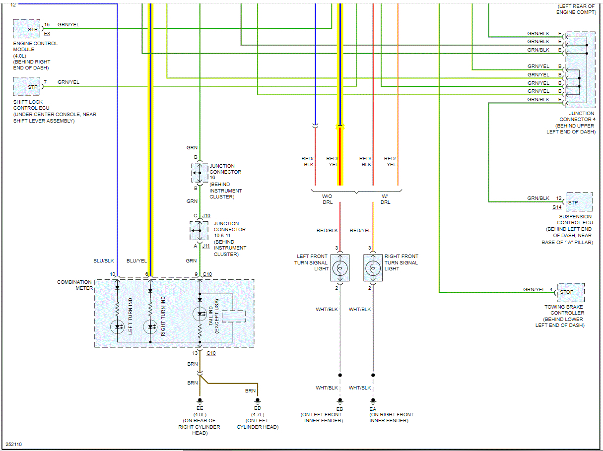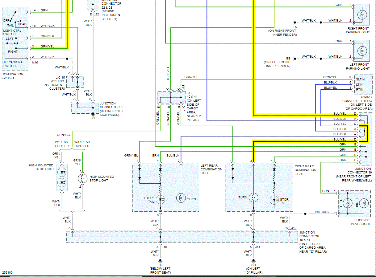 Here is what I need you to do: First, I attached the wiring schematic for the exterior lighting system below. At the signal lamp (rear) will be a blue wire with a yellow tracer. Using a test light or voltmeter, make sure you have a good ground and then with the signal on, check for power at that wire.