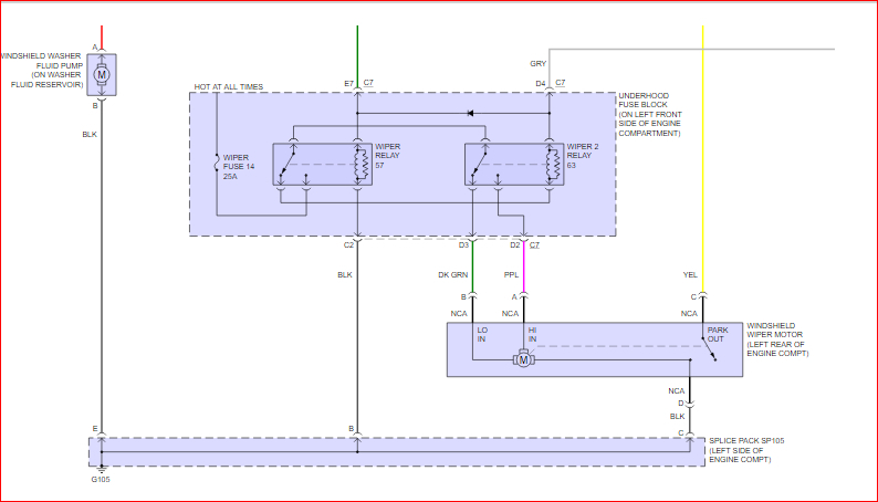 Wipers will not work at all. I replaced on-off and hi-low relays but did not help. It has power to motor and resistance on two wires in intermittent setting. I believe it is the motor, but would like to know the color codes of the four wires going to the motor to verify. Can you help? Thanks