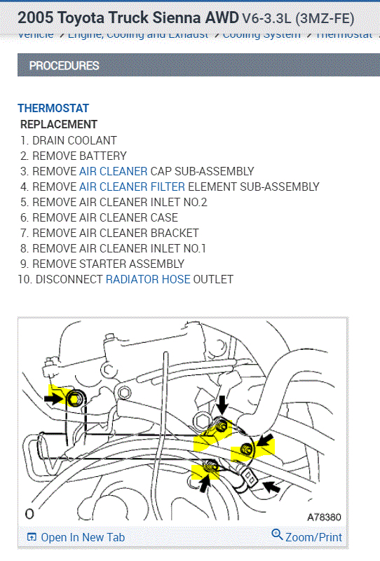 I attached the directions for replacing it below. If you look at pics 1 and 2, I highlighted points of interest. In pic 1, I highlighted the bolts holding it in place. Note: There is also an electrical connection that will need unplugged. In pic 2, I highlighted what is called a jiggle valve. That is on the thermostat itself (which I would replace at this point). Make sure that is positioned correctly. It allows air to exit the cooling system while refilling the coolant. If you point it directly down (6 o'clock) it will be very hard to bleed the system.