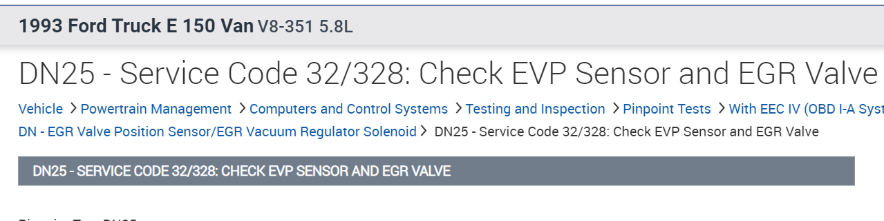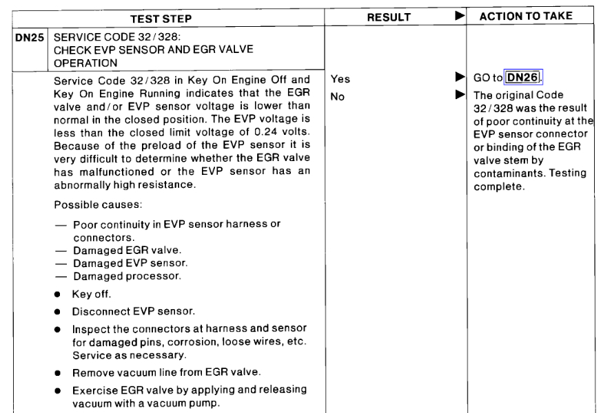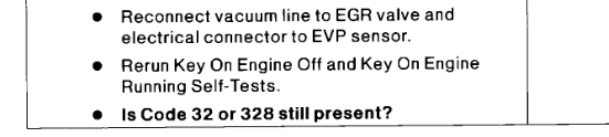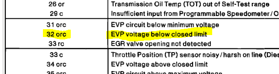 Based on your description, it sounds like a code 32. That code is related to the EVP sensor. The EVP sensor monitors the position of the EGR valve. In this case, it indicates the voltage is less than the fully closed position. So, there is a chance that the connector is loose, corroded, the wiring to it is damaged, or the sensor itself is bad. See pic 1 below for a description