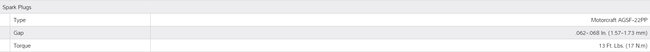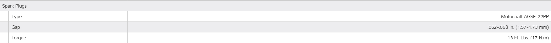 I have included the torque specifications as well as the firing order. It also lists Ford's part number for the plugs and the gap.