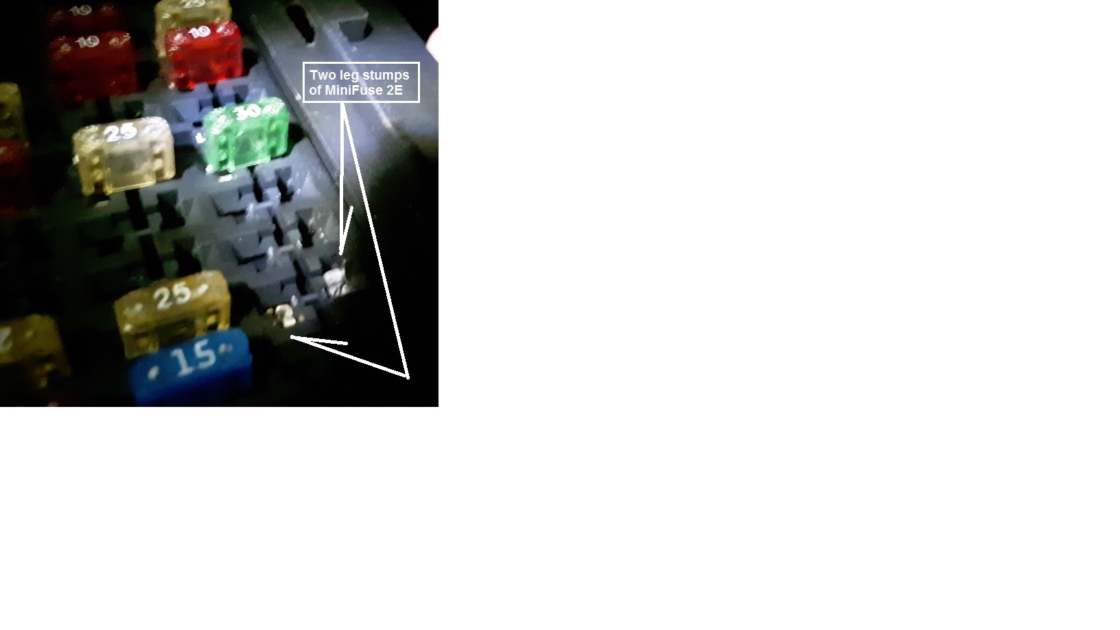 If that does not work, I guess I could snip the two wires going into socket 2E, and solder them to a regular 10A MiniFuse. From prior notes, one of the socket 2E wires is a thick, white wire, and the other is a slim, dark-brown wire. Both wires clearly enter the back of socket 2E.