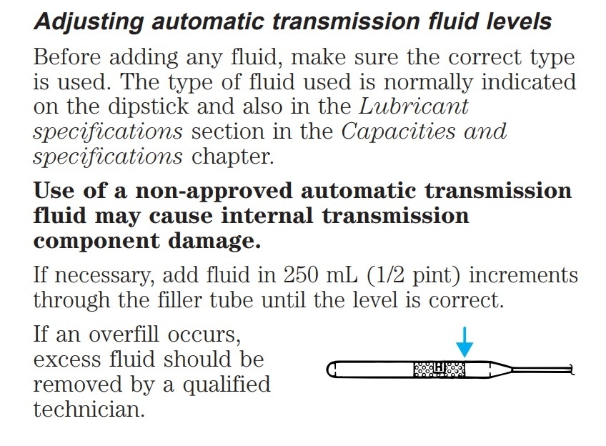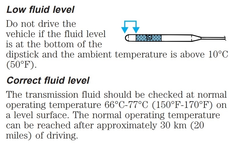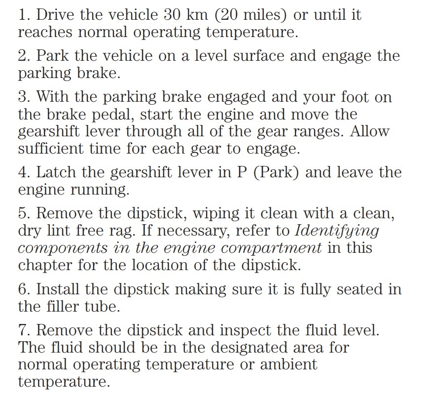 Attached you will find the section of the owner's manual that covers the fluid checks on that car. It uses Mercon V fluid. If the mileage you posted is correct you have a record holding car.