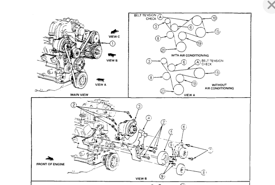 The first 2 diagrams below are for a 3.0L with and without A/C. The next two are for the 4.0L with and without A/C.