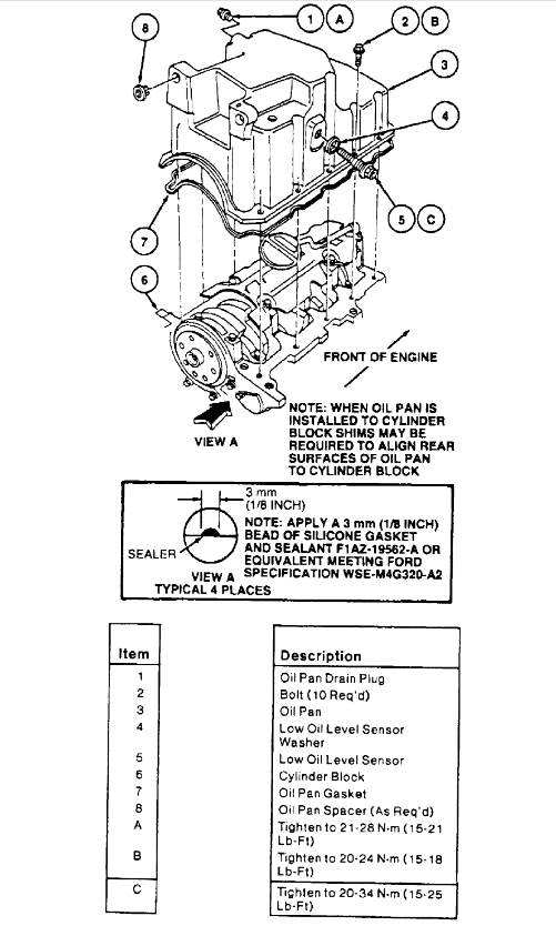 2. Apply 1/8 inch bead of silicone gasket and sealant F1AZ-19562-A, or equivalent, to parting lines of oil pump and crankshaft rear main seal retainer on cylinder block at oil pan sealing surfaces.