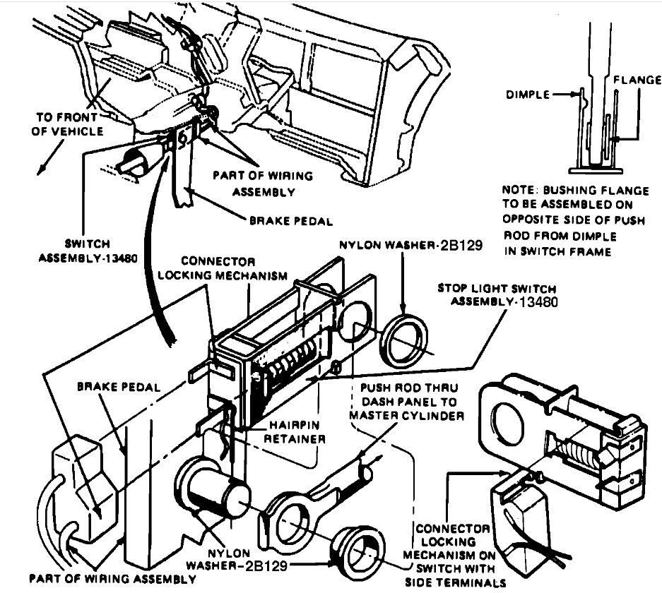Changing the switch is easy, unplug the switch, pull the retaining pin out, remove the white washer, and slide the switch and black spacer off. To install, put the black spacer on, (not all the way)install the switch with the slotted opening over the black spacer and on the pedal dowl, slide the switch and spacer all the way on, install washer and pin and reconnect the connector. Check the connector for broken wires and heat damage.