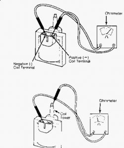 1. With ignition switch in "OFF" position, disconnect ignition coil connector. Inspect connector for dirt, corrosion or damage. Measure resistance across ignition coil positive and negative terminals. See Fig. 4 . 2. Resistance should measure .3-1.0 ohm. If so, ignition coil primary circuit is okay. Proceed to IGNITION COIL SECONDARY RESISTANCE test. If resistance is less than .3 ohm or greater than one ohm, replace ignition coil. IGNITION COIL SECONDARY RESISTANCE 1. With ignition switch in "OFF" position, disconnect ignition coil connector and secondary wire from coil tower. Measure resistance between negative coil terminal and coil tower. See Fig. 4 . 2. Resistance should measure 6500-11,500 ohms. If so, ignition coil is okay. Proceed to WIRING HARNESS test. If resistance is less than 6500 ohms or greater than 11,500 ohms, replace ignition coil.