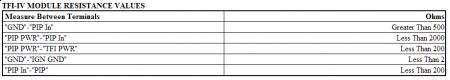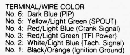 WIRING HARNESS 1. Disconnect wiring harness connector from ignition module. Inspect connector for dirt, corrosion or damage. Disconnect wire at "S" terminal of starter solenoid. 2. Attach negative voltmeter lead to distributor base. Measure battery voltage. With negative lead of voltmeter still connected to distributor base, check voltages at TFI-IV ignition module wiring harness terminals. See Fig. 5 . See WIRING HARNESS TEST table.