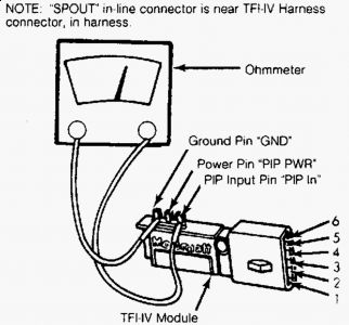 TFI-IV IGNITION MODULE 1. Disconnect "Spout" in-line connector at TFI-IV module. Connect Spark Tester (D81P-6666-A) between ignition coil and engine ground. See Fig. 7 . Crank engine and check for spark at tester. If no spark occurs, perform IGNITION COIL PRIMARY RESISTANCE test. 2. If spark occurs, check Profile Ignition Pick-Up (PIP) and ignition ground wires for continuity. Repair as necessary. If these items are okay, go to appropriate ELECTRONIC ENGINE CONTROL IV article in COMPUTERIZED ENGINE CONTROL section listed below.