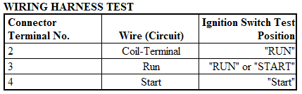 3. If all readings are at least 90% of battery voltage, wiring harness and connectors are okay. Go to STATOR test. If reading is less than 90% of battery voltage, inspect wiring harness and connectors. Also check for a worn or damaged ignition switch. Repair or replace as necessary. Turn ignition off. Remove voltmeter. Connect "S" terminal to starter solenoid. Fig. 5: Wiring Harness Test Courtesy of FORD MOTOR CO. STATOR 1. Turn ignition switch to "OFF" position. Remove and ground coil wire. Attach digital voltmeter negative lead to distributor base. Disconnect spout in-line connector near distributor. Attach positive lead to ignition module side of connector. 2. Place ignition switch in the "ON" position. Using ignition key, bump starter 4-5 times and measure voltage while engine is stationary. Allow digital voltmeter reading to stabilize before taking measurement. Record all values. 3. If lowest reading is less than 0.5 volts, replace stator assembly. If highest reading is less than 70% of battery voltage, but the lowest reading is greater than 0.5 volts, remove TFI-IV ignition module from distributor. 4. Inspect stator and TFI-IV terminals for misalignment or damage. If terminals are okay, replace stator assembly. 5. Measure resistance between TFI-IV module terminals. See Fig. 6 . Refer to the TFI-IV MODULE RESISTANCE VALUES table.