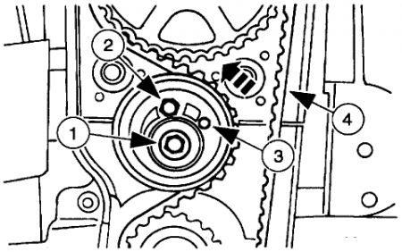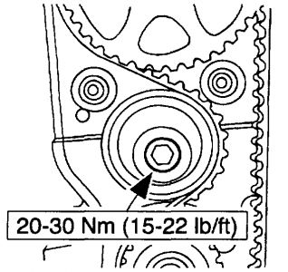 NOTE: Install the timing belt over the sprockets in a counterclockwise direction starting at the crankshaft. Keep the belt span from the crankshaft to the camshaft tight while installing the timing belt over the camshaft.