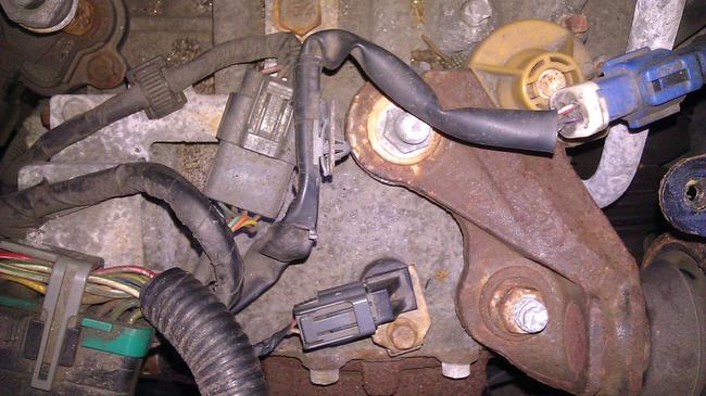 There are a few connectors atop the transmission. I worked on the only connector with two wires. Held on with one 10 mm bolt.