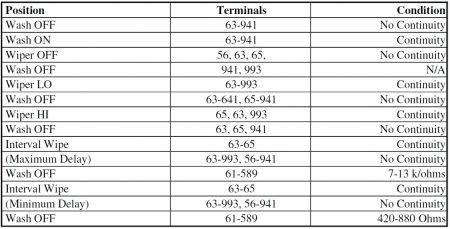 WIPER SWITCH Check for continuity between switch terminals. See Fig. 3 . See WIPER SWITCH CONTINUITY table. To detect marginal operation of switch, move switch lever while making measurements. If continuity or resistance is not as specified, or if continuity is poor in any position, replace switch.