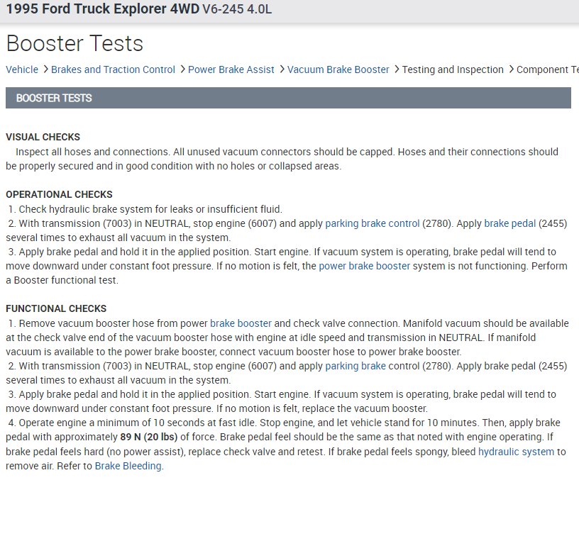Operate engine a minimum of 10 seconds at fast idle. Stop engine, and let vehicle stand for 10 minutes. Then, apply brake pedal with approximately 89 N (20 lbs) of force. Brake pedal feel should be the same as that noted with engine operating. If brake pedal feels hard (no power assist), replace check valve and retest