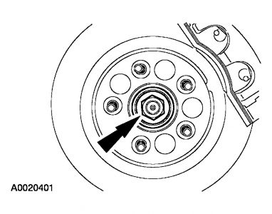 CAUTION: Do not loosen the front axle wheel end nut until after the wheel and tire assembly are removed from the vehicle. Wheel bearing damage will occur if the wheel bearing is unloaded with the weight of the vehicle applied.