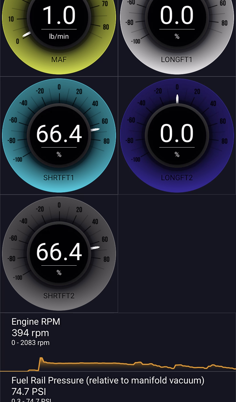 One day I was on the highway and the accelerator stopped working for like two seconds then came back. I then got off the highway and ended up at a stop light and the vehicle had an erratic idle, jumping up and down so I put it in park, and started to rev a little bit to prevent it from stalling. I pulled off the road and the vehicle shut off, I started it back up and everything was fine. I got it home and seen that I had a fuel rail pressure code P0193 and system too lean bank 2 P0174. I hooked up my scan tool and measured fuel trims, fuel pressure and MAF sensor readings. I will put a picture below. Looking at the data I know STFT isn’t supposed to be so high, also fuel pressure is way too high, usually it’s 39-40 PSI. MAF sensor readings also don’t seem right either. I assume I need either a fuel rail pressure sensor, a fuel filter or MAF sensor or all three? I should also state that after resetting the codes and starting up the vehicle is stalled within seconds, and I got the Fuel rail pressure code but not the bank 2 too lean code. Any help is appreciated.