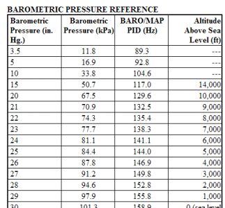 NOTE: Remember that most weather services report a local barometric pressure that has been corrected to sea level. the BARO PID, on the other hand, reports the actual barometric pressure for the altitude the vehicle is being operated in. Local weather conditions (high and low pressure areas) will change the local barometric pressure by several inches of mercury (+/-3 Hz, +/-1 in. Hg.). NOTE: BARO is updated only when the vehicle is at high throttle openings. Therefore, a vehicle which is driven down from a higher altitude may not have had an opportunity to update the BARO value in KAM. If you are not confident that BARO has been updated, perform three or four heavy, sustained accelerations at greater than half-throttle to allow BARO to update.